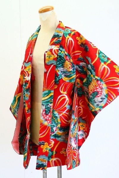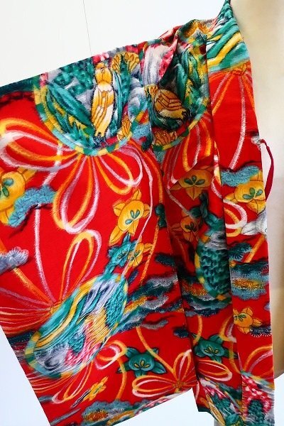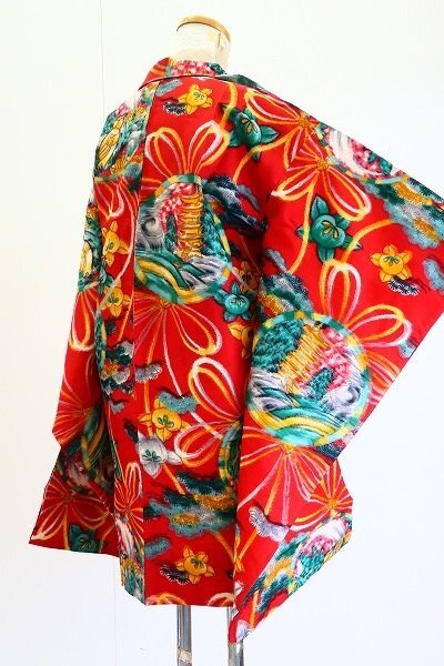 アンティーク、銘仙の羽織です。 赤の絹地に、京都 五重塔があしらわれています。 ※アンティーク品としては大変状態は良いですが、アンティーク品にご理解ある方のみご入札をお願いします。 |