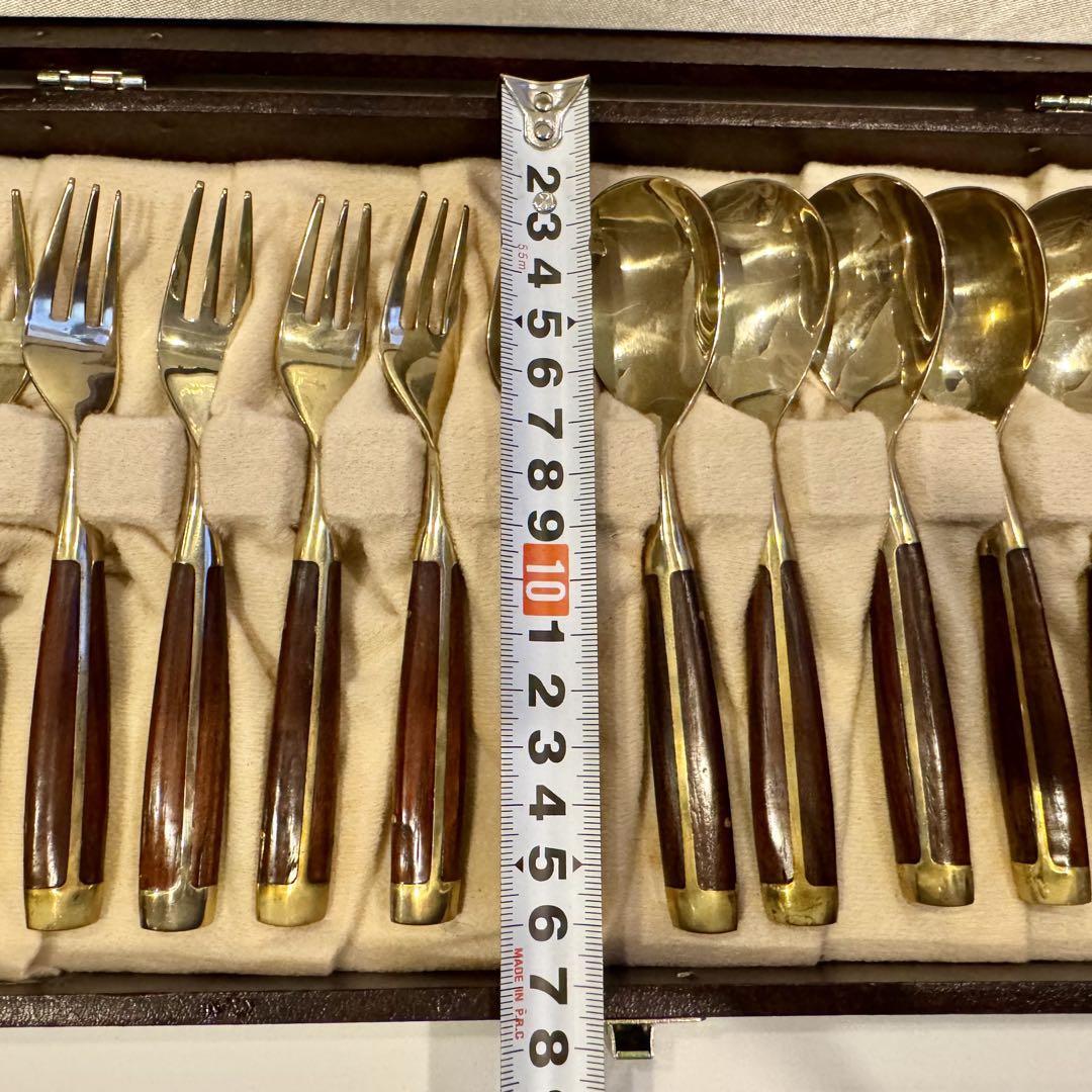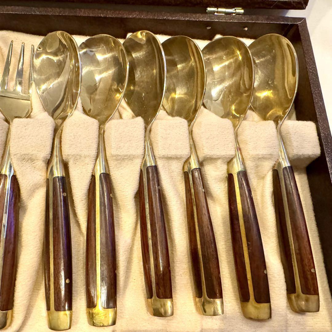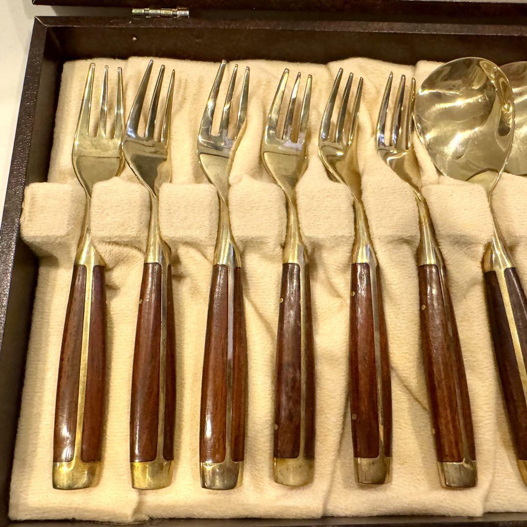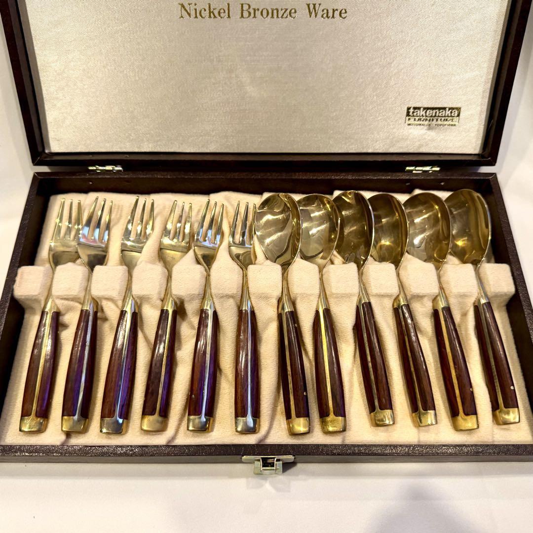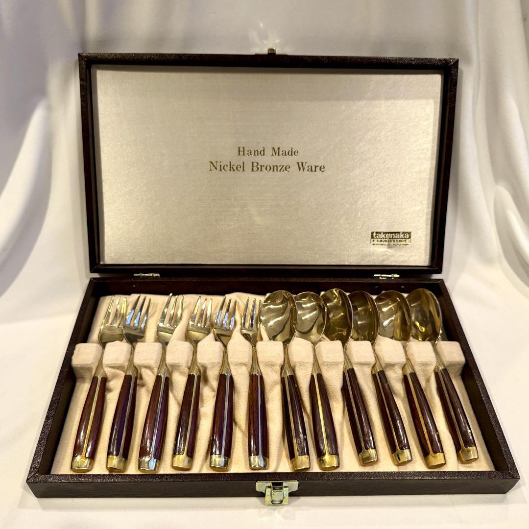 横浜 元町 竹中 ニッケルブロンズ製 ウッドハンドル ハンドメイド カトラリーセット ◆スプーン フォーク ◆箱入りの出品です。