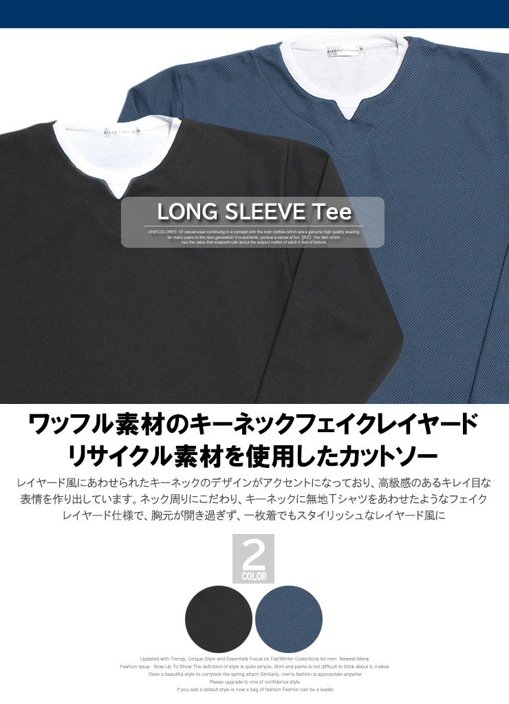 商品説明 | ワッフル素材のキーネックフェイクレイヤード長袖Tシャツに、リサイクル素材を使用したカットソーも追加で登場です。 |