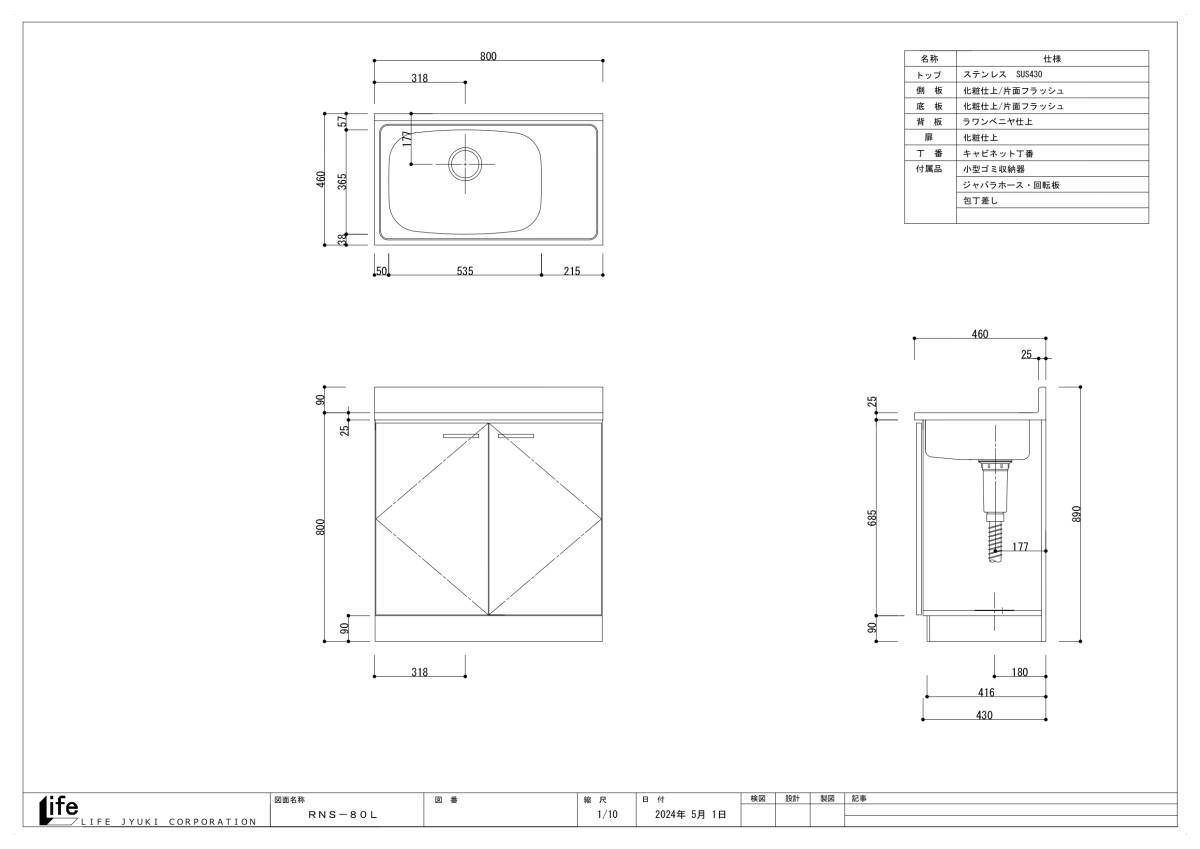 【ライフ住器】RNS-80L 13色対応 流し台 800×460【日本製】