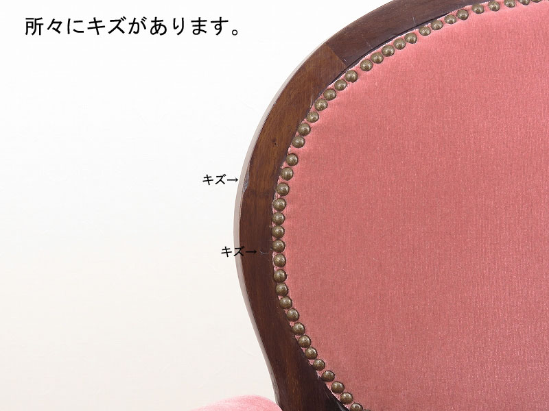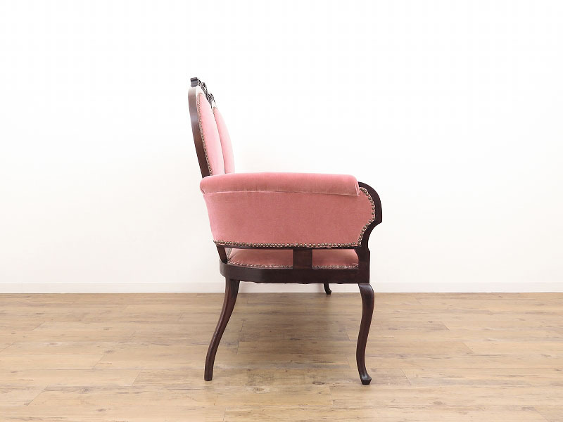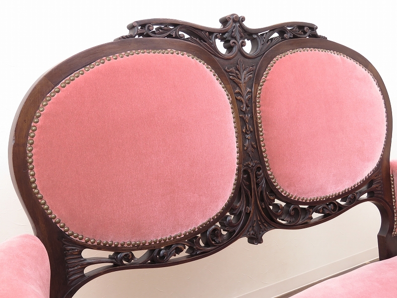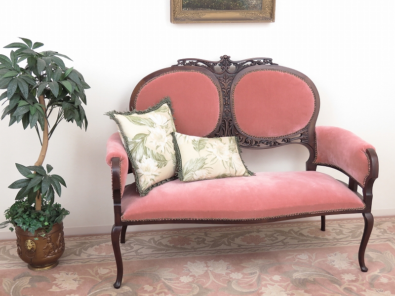 マホガニーの繊細な脚と背もたれの豪華な彫刻が素敵なイギリスのセティです。エレガントなデザインに合わせて張られたピンク系の張り地が印象的な商品です。アームなしの椅子2脚とアームチェア2脚の5点セットで買い付けましたが、それぞれ単品で販売し、セティのみとなりましたので《 セール品 ¥286,000 → ¥198,000 》として出品させていただきます。