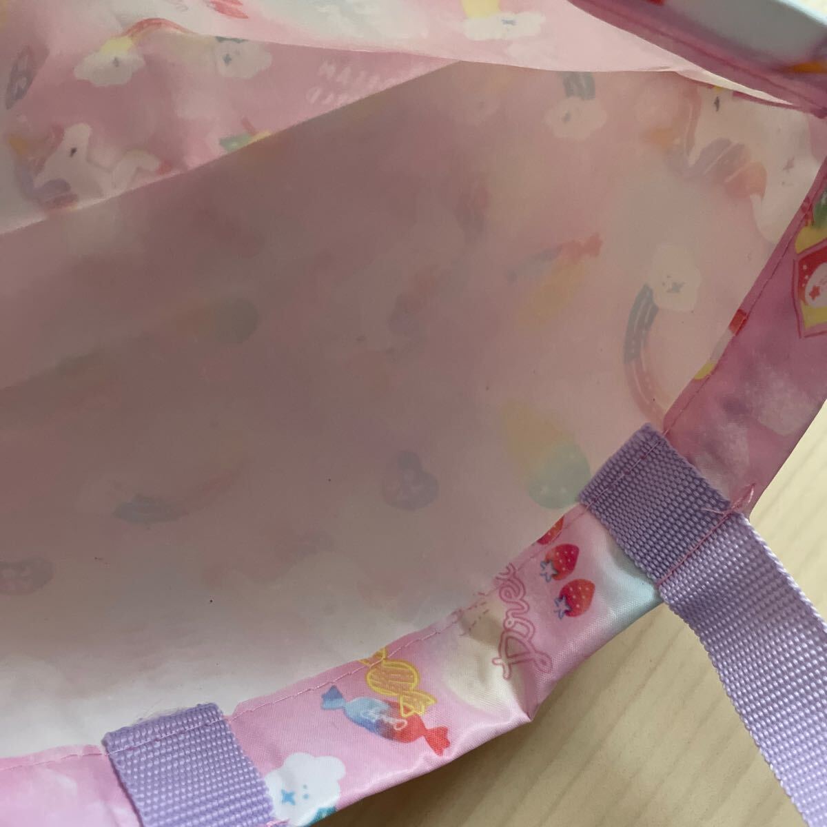 素材はナイロンで、取っ手を除いた大きさは縦約32cm横約25cmマチ約5cmです。