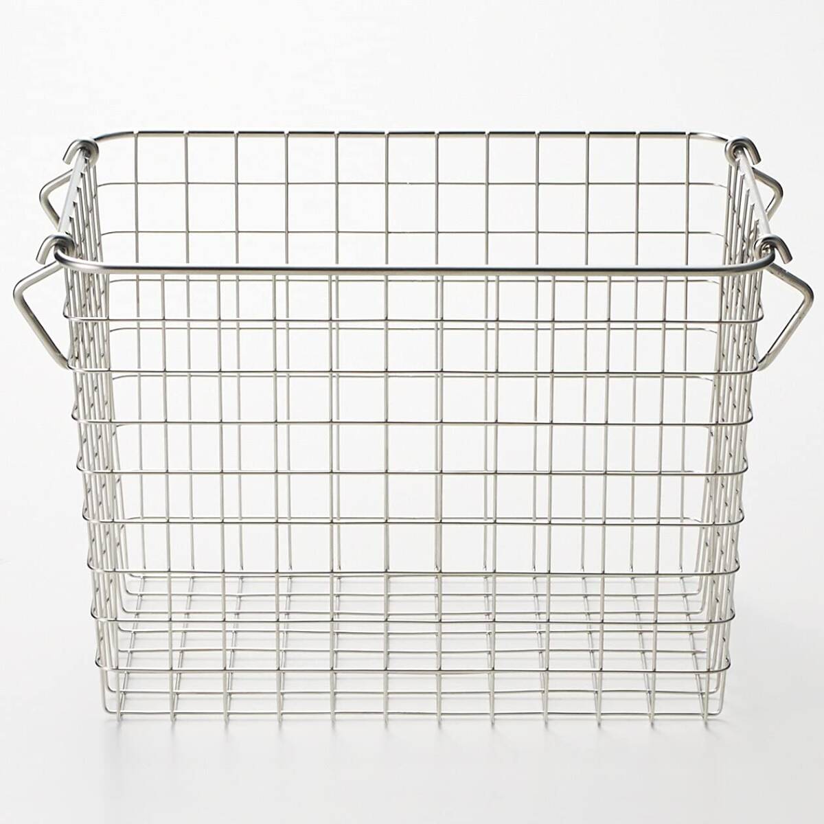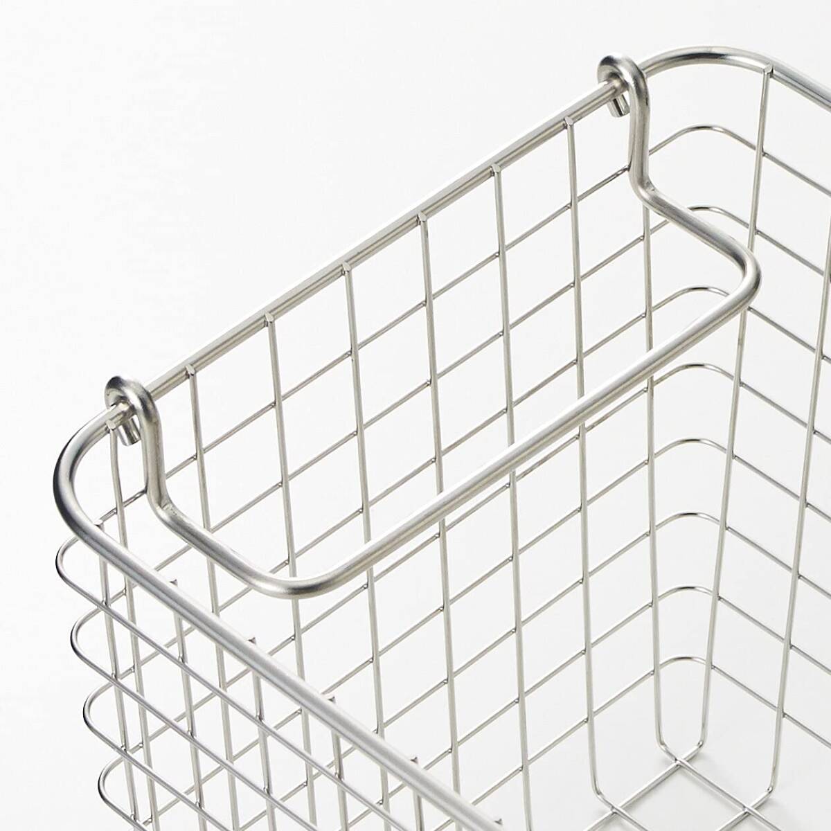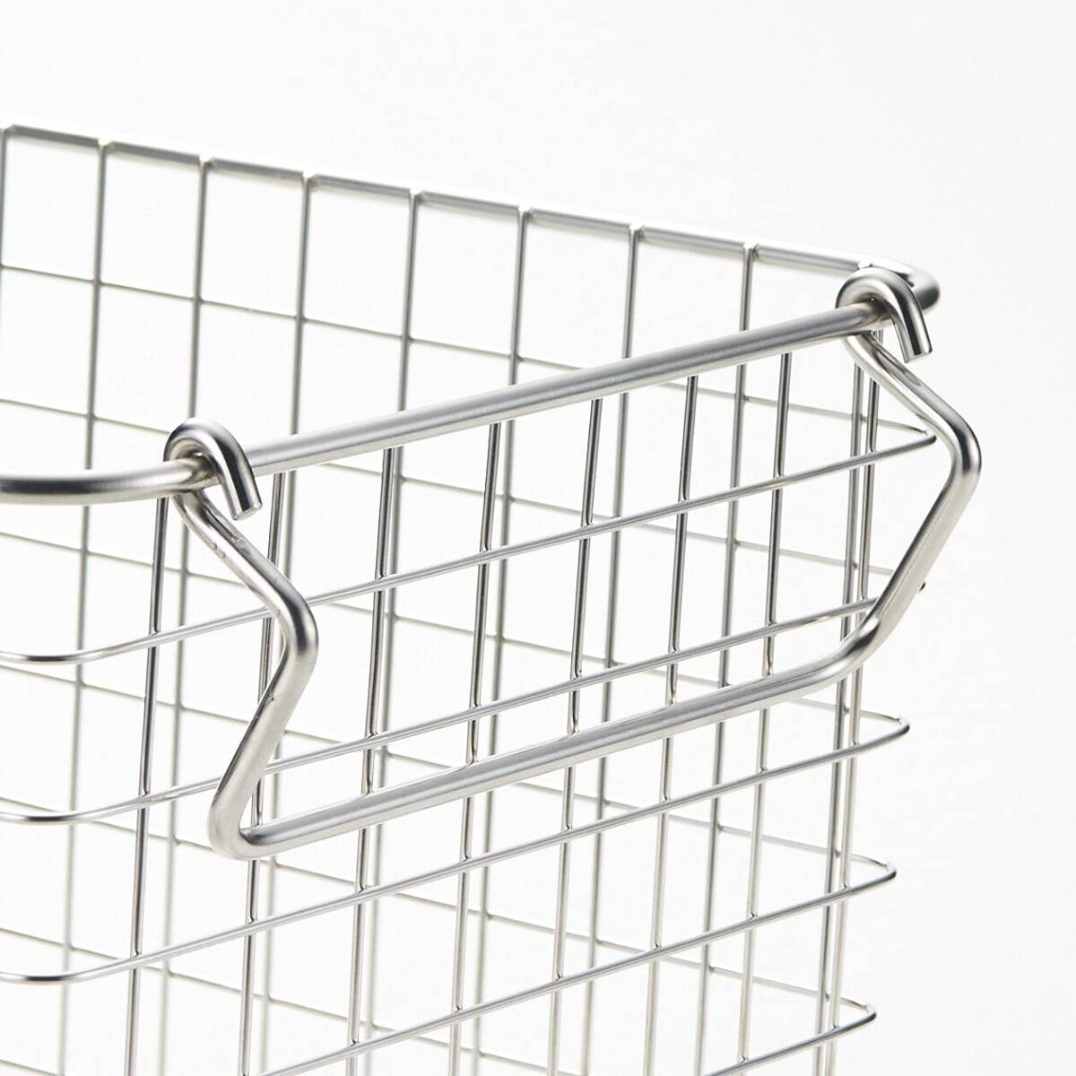 錆びにくいステンレスを使用したバスケットです。持ち手を内側におさめると積み重ねもできます。