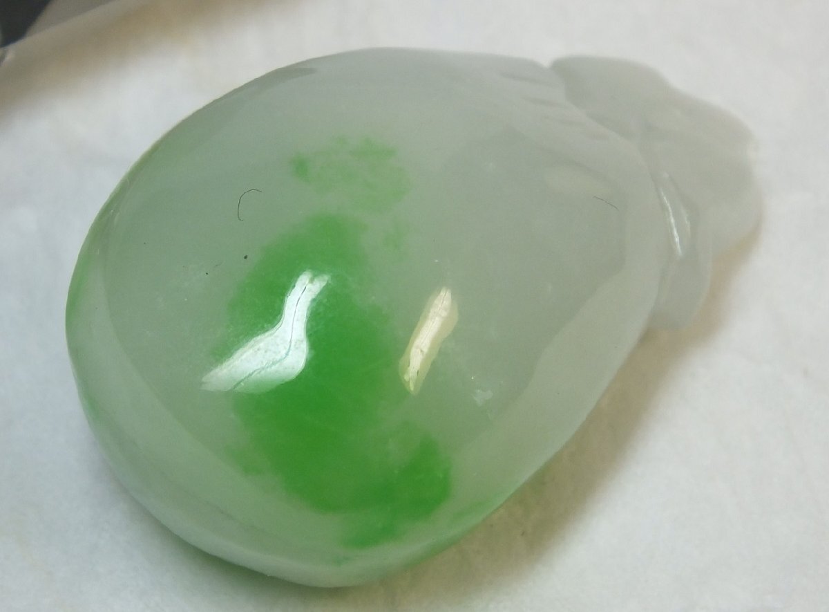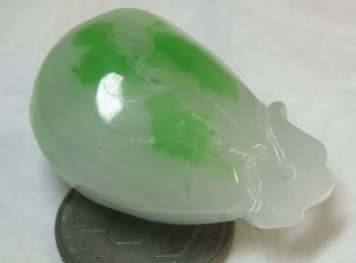 | ▲商品説明▲ | サイズ:40×24×厚19mm 重さ:27.2g 緑色が綺麗なミャンマー翡翠。縁起柄の甜瓜が彫り込まれています。石コレクションやお守りに。上部に貫通穴が有るのでペンダントトップや下げ飾り等にもなります。 ☆商品につきましては注意を払った検品を行っておりますが、稀に石の表面に、彫りとは違うクラック状の筋や凹みが見受けられる場合が御座います。それは石本来の石紋で傷ではありません(割れが生じ易いヒビではありません)。返品の対象にはなりませんのでその旨御了承の上、ご検討下さい。 |