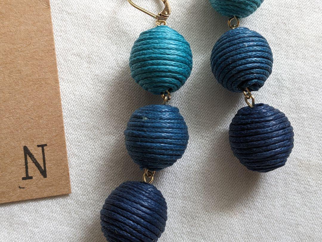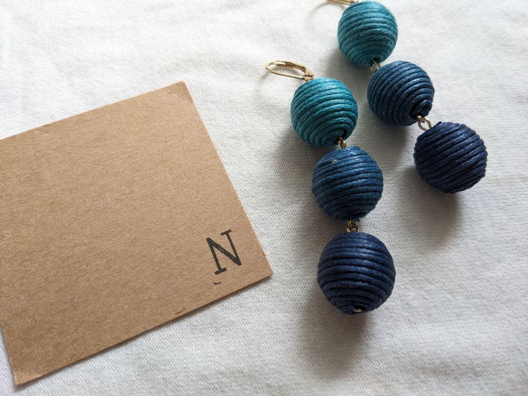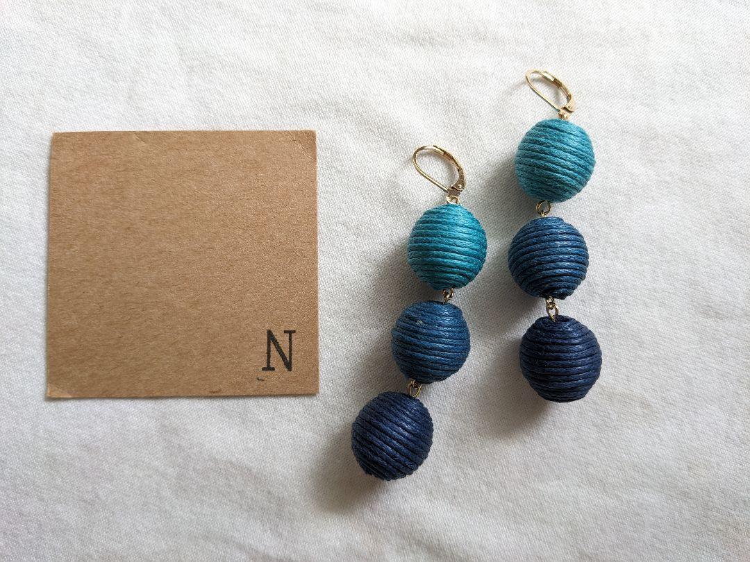 3色の糸巻きビーズをグラデーションにしましたピアスです。ロングワンピースやワイドパンツ、デニム、ブラウスなどに。