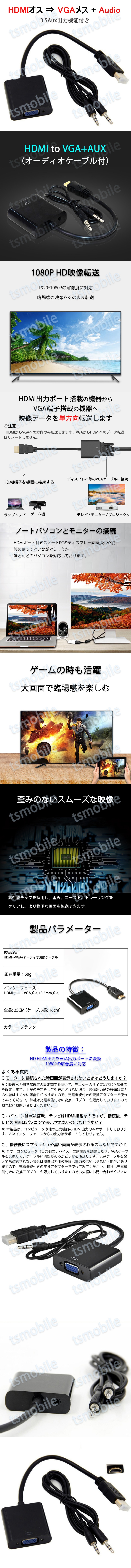 | HDMIオスtoVGAメス+AUXメスへの変換アダプター手元にあるVGA入力のモニターをパソコンに接続したい時、パソコンはHDMIポートしかない場合、こちらの変換アダプターを使ったら、パソコンとモニターの接続は実現可能です。VGAケーブルは予めご用意ください。HDMI出力ポート搭載の機器からVGA端子を搭載する機器へ映像データを転送します注意点:HDMIからVGAへの方向のみ転送できます、VGAからHDMIへの転送はサポートしません。1080P映像のロスレス伝送オーディオ音声データを3.5mmAuxポートで出力可能適用範囲:パソコン(HDMI出力)とモニター、テレビ、ディスプレーの機器(VGA入力)の間の接続 映像 画像転送 画面複製 画面拡張,スピーカーへ音声送信ご購入前にインターフェースタイプをよくご確認ください。本製品は標準HDMIインターフェース搭載です。標準HDMIインターフェースのサイズは約14mm × 4.5mm。 |