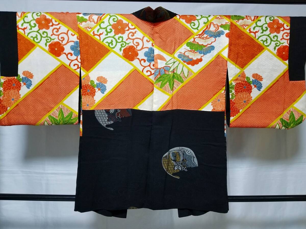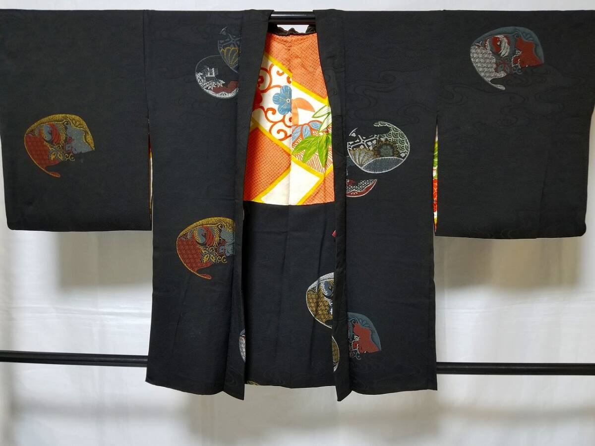 *手縫い袷仕立品 *着用感なし *検品済 *美品 {生地} ☆正絹 紋綸子地 ☆羽織重さ 約610g {地色} ☆真黒色地 ☆画像では少し白っぽく写ってますが実物は真黒色です**ご安心ください {模様} ☆極細「金糸」「銀糸」「多色.色箔糸」での縫い取り加工の「多種類.吉祥文様」文 {羽織 裏地} ☆正絹 本染加工の「古来.伝統.吉祥文様」 {寸法} 羽織丈 {肩から裾まで} 約79cm 裄丈 約64cm {袖付け縫い代 袖側 約2.5cm 身側 約2cm} 袖丈 約47cm 袖幅 約33cm 前幅 約18cm 後幅 約28.5cm (発送方法) | |||