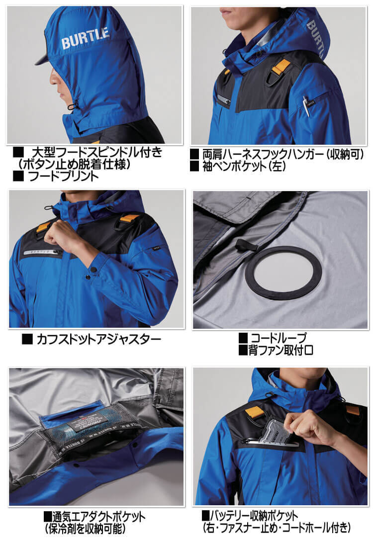 ・ヘルメットに対応する大型フードは用途に合わせ着脱可能