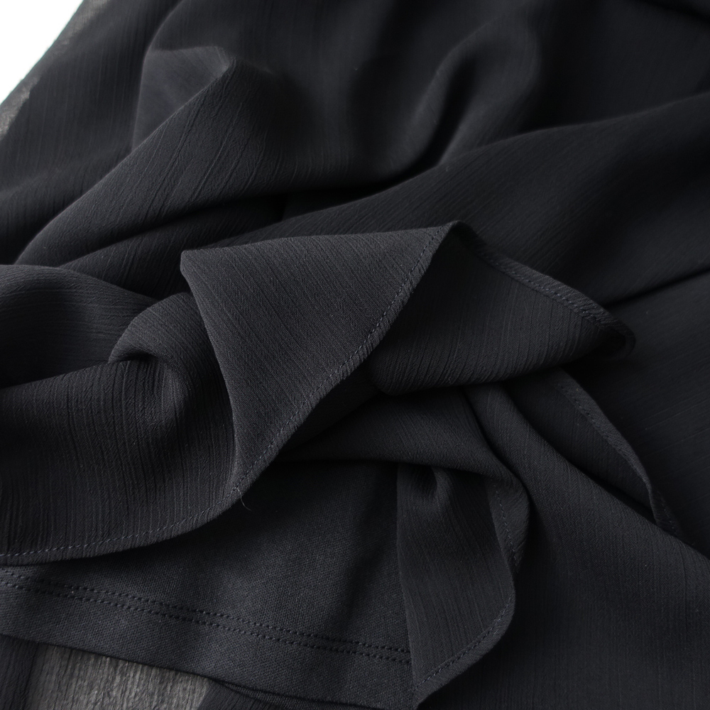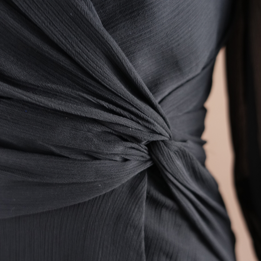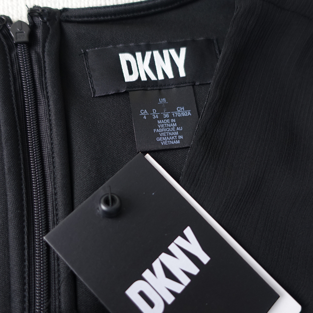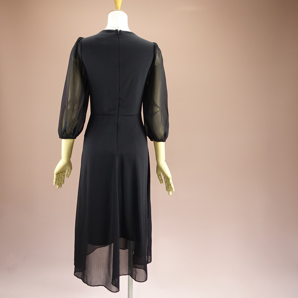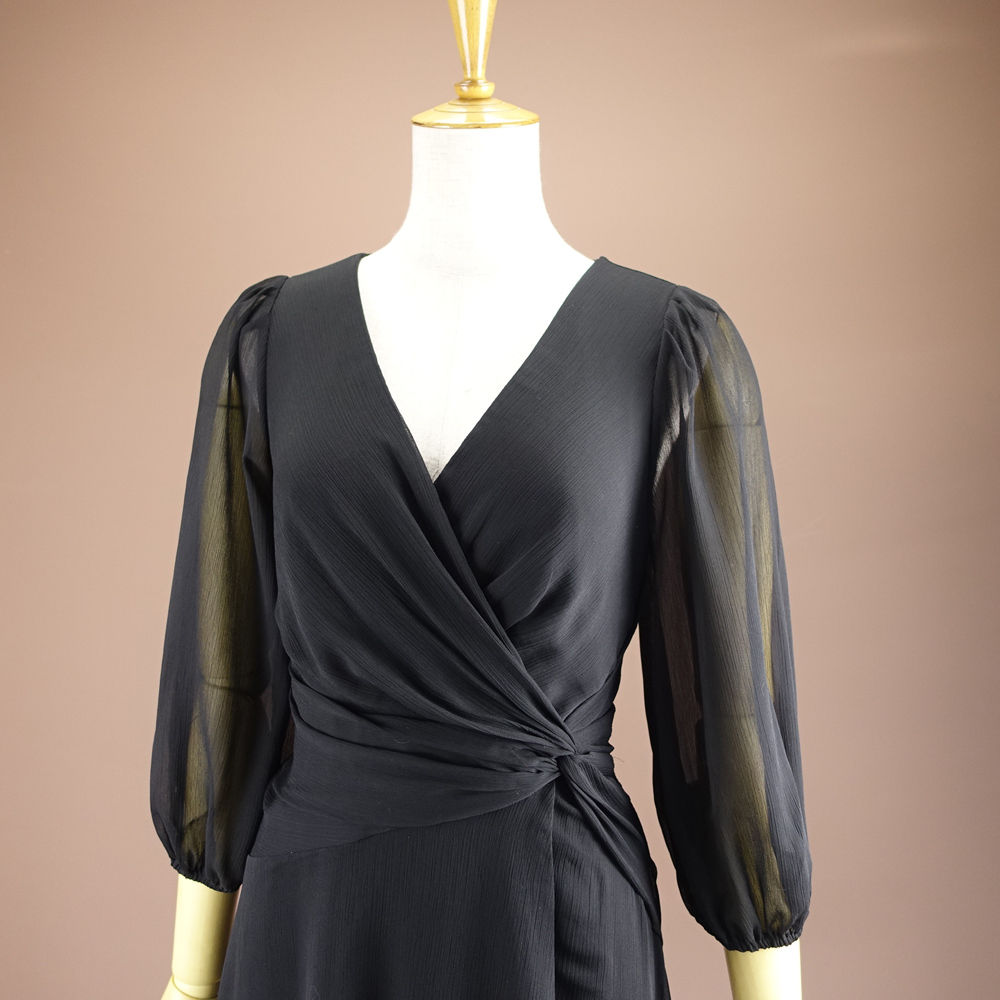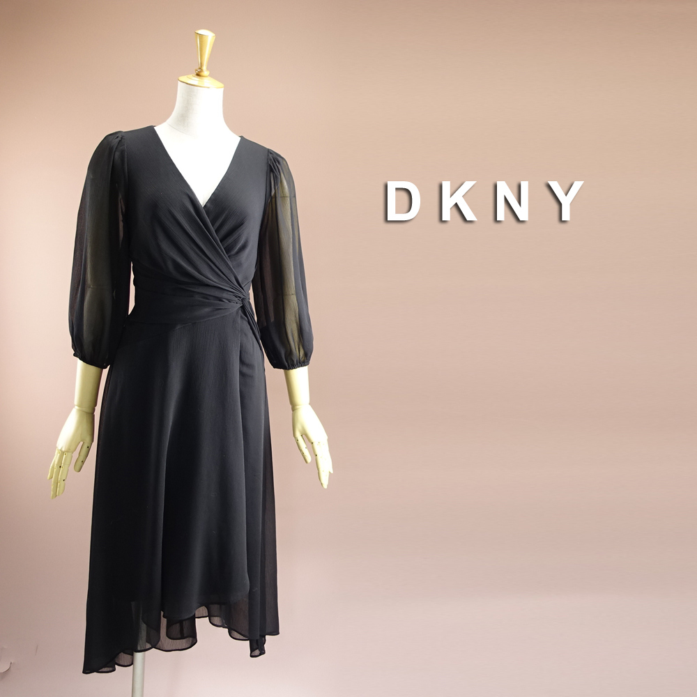 新品.DKNYダナキャラン 6/13号 黒 ワンピース Vネック パフスリーブ カシュクール風 シフォンドレス 長袖 食事会 輝41Y0805