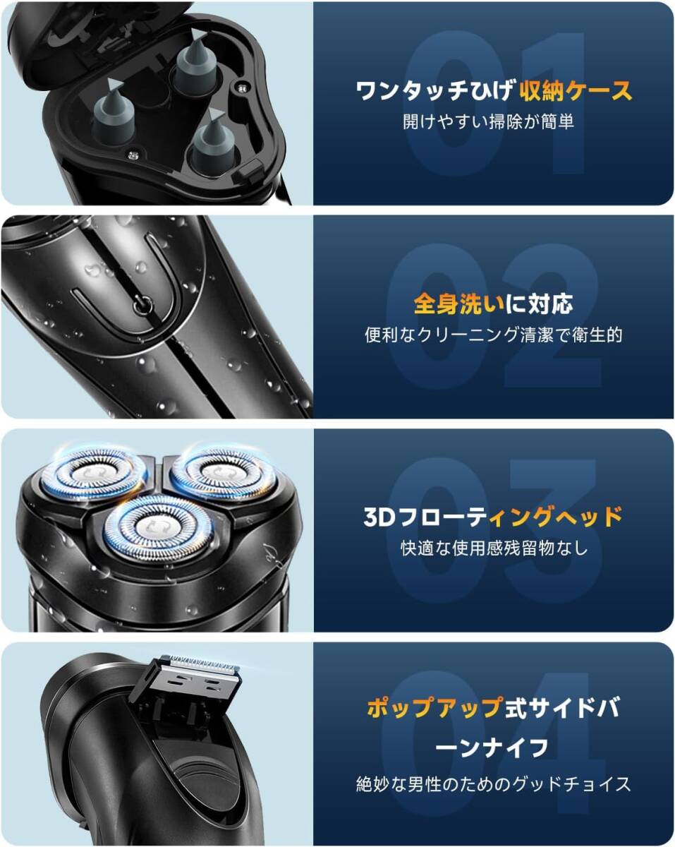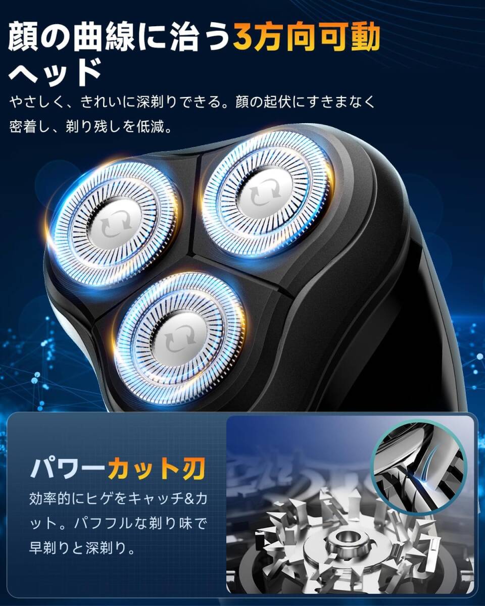 • 【360°回転ヘッド&高い密着度】 電気シェーバー メンズ 髭剃り は360°回転ヘッドを搭載し、どんな角度からでも肌に密着し、滑らかで快適な剃り心地を実現。複雑な顔の輪郭にも簡単に対応し、一回のストロークで完璧な剃り上がりをお約束。回転式シェーバーは往復式シェーバーと比較し、同じ時間で優れた仕事率を発揮します。顔の凹凸に密着しやすく、柔軟に可動するヘッドの搭載により、剃り残しを低減可能です。シェーバーのバックにバリカンが追加され、もみあげと口髭を剃ることができます。