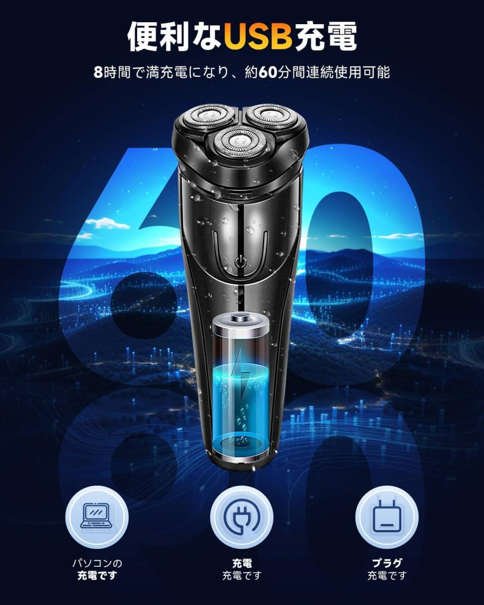 • 【低騒音設計&USB急速充電】髭剃りはノイズも40デシベル未満のに、早朝や深夜でも遠慮なく使用可能です。使いやすくて便利なUSBプラグ Type-C 充電、髭剃り 電動 メンズシェーバー 人気 USB充電で、8時間で充電が完了し、約60分連続して使用することができ、日常の使用や旅行に便利を提供します。便利なUSB充電タイプなので、パソコン、車載充電器やモバイルバッテリーなどUSBポートのあるところで充電しでき、出張先、旅行先、車内でのご利用も楽です。