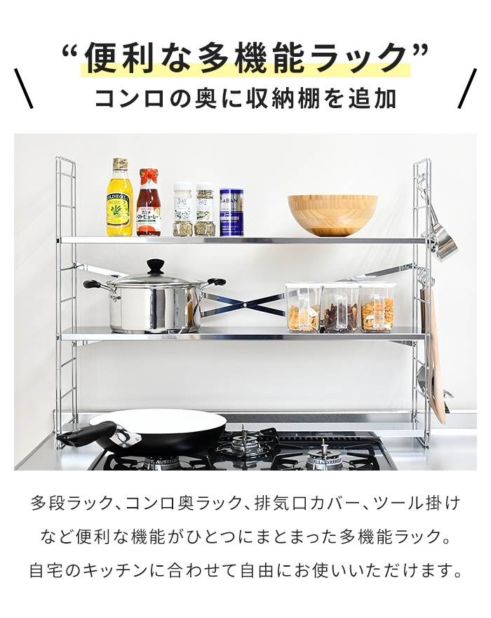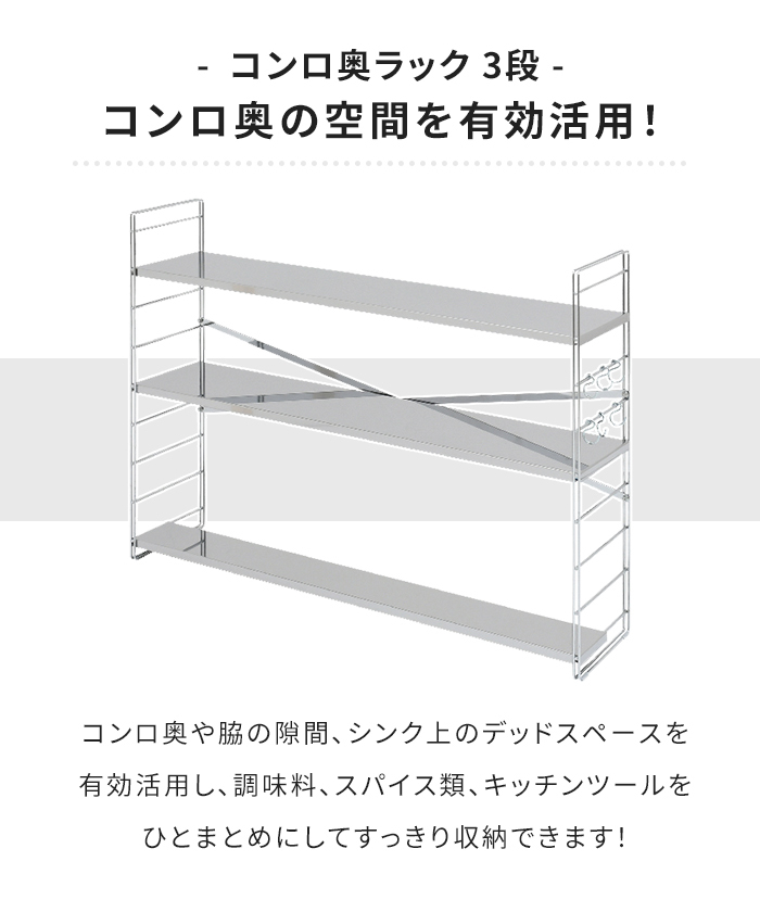 | コンロ奥ラック ステンレス製 日本製 多機能ラック 調味料ラック 幅80cm 3段 キッチンラック 排気口カバー S字フック付き ステンレス製コンロ奥ラック ステンレスラック 収納ラック オープンラック スリムラック キッチン用品 スパイス収納 コンロ奥 便利 調理器具置き シンプル スタイリッシュ |