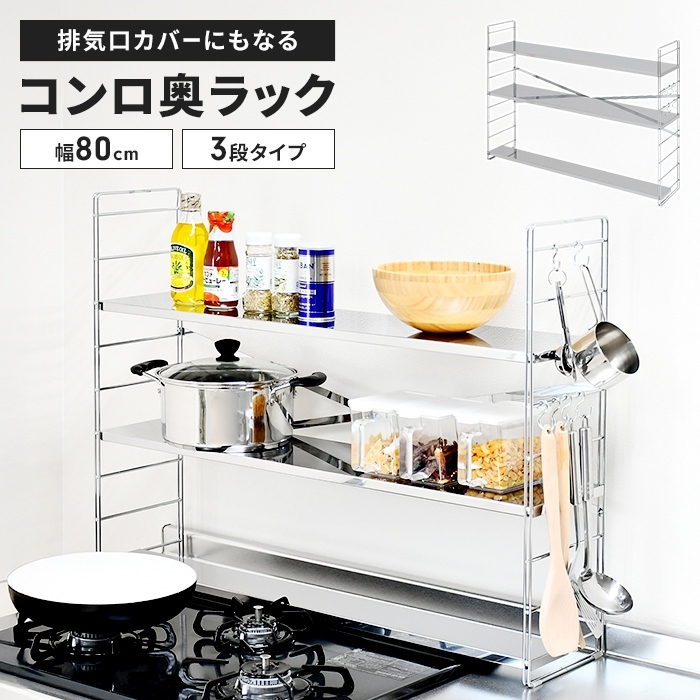 | コンロ奥ラック ステンレス製 日本製 多機能ラック 調味料ラック 幅80cm 3段 キッチンラック 排気口カバー S字フック付き ステンレス製コンロ奥ラック ステンレスラック 収納ラック オープンラック スリムラック キッチン用品 スパイス収納 コンロ奥 便利 調理器具置き シンプル スタイリッシュ |