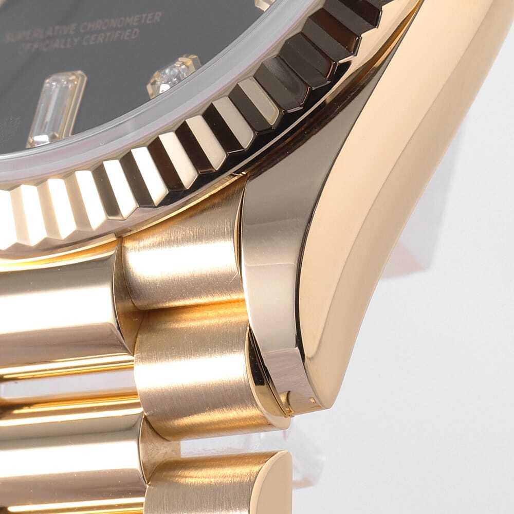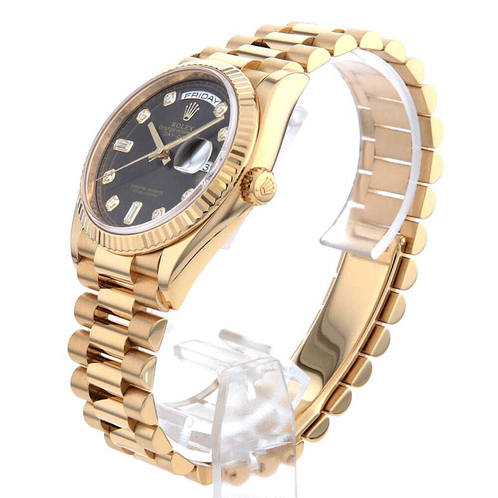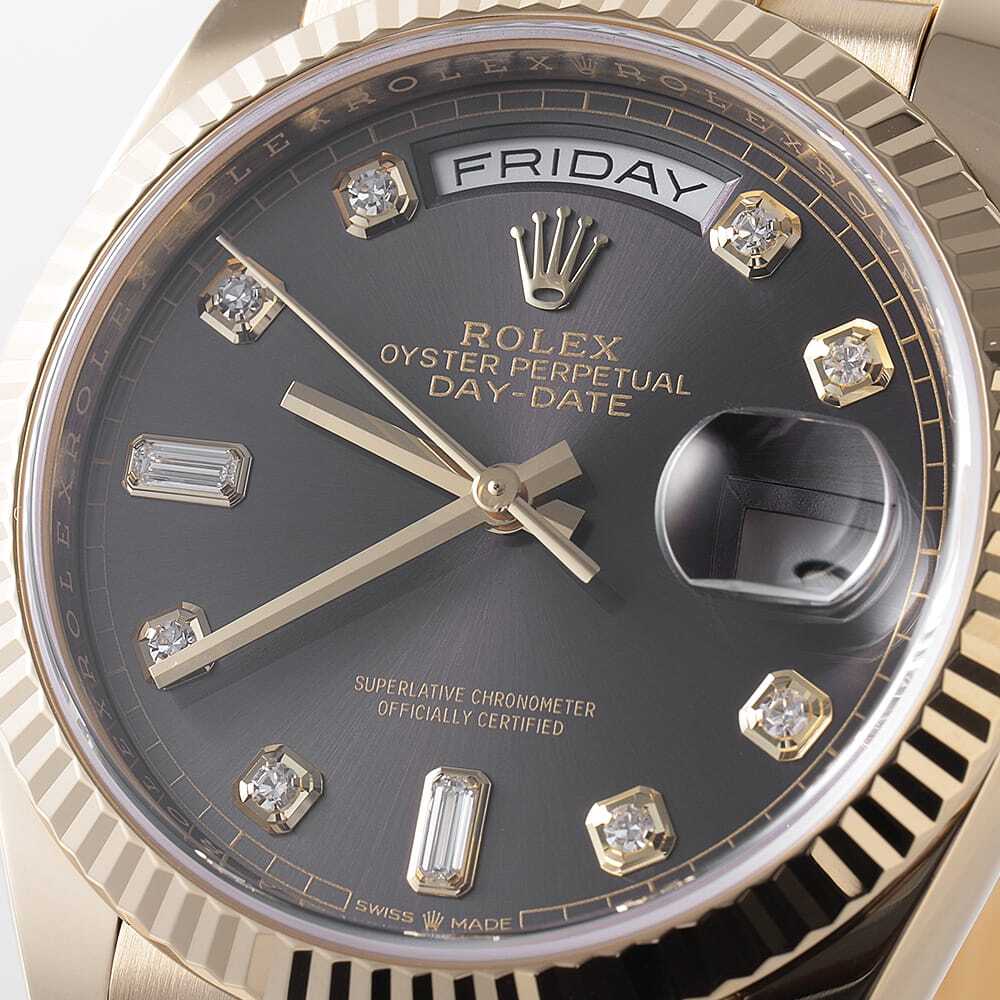 モデル情報 | 2019年発表、金無垢ケース径36mmのデイデイトです。8粒のダイヤモンドと2粒のバゲットダイヤモンドがブラックカラー上に配されているため、ダイヤの光沢感がより一層際立ちます。ムーブメントにはロレックスが開発した新世代ムーブメントキャリバー3255を搭載。パワーリザーブ約3日間。100m防水仕様。 |