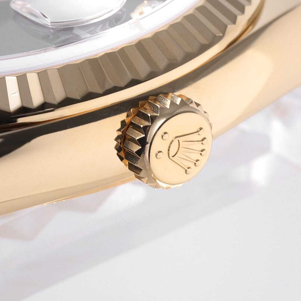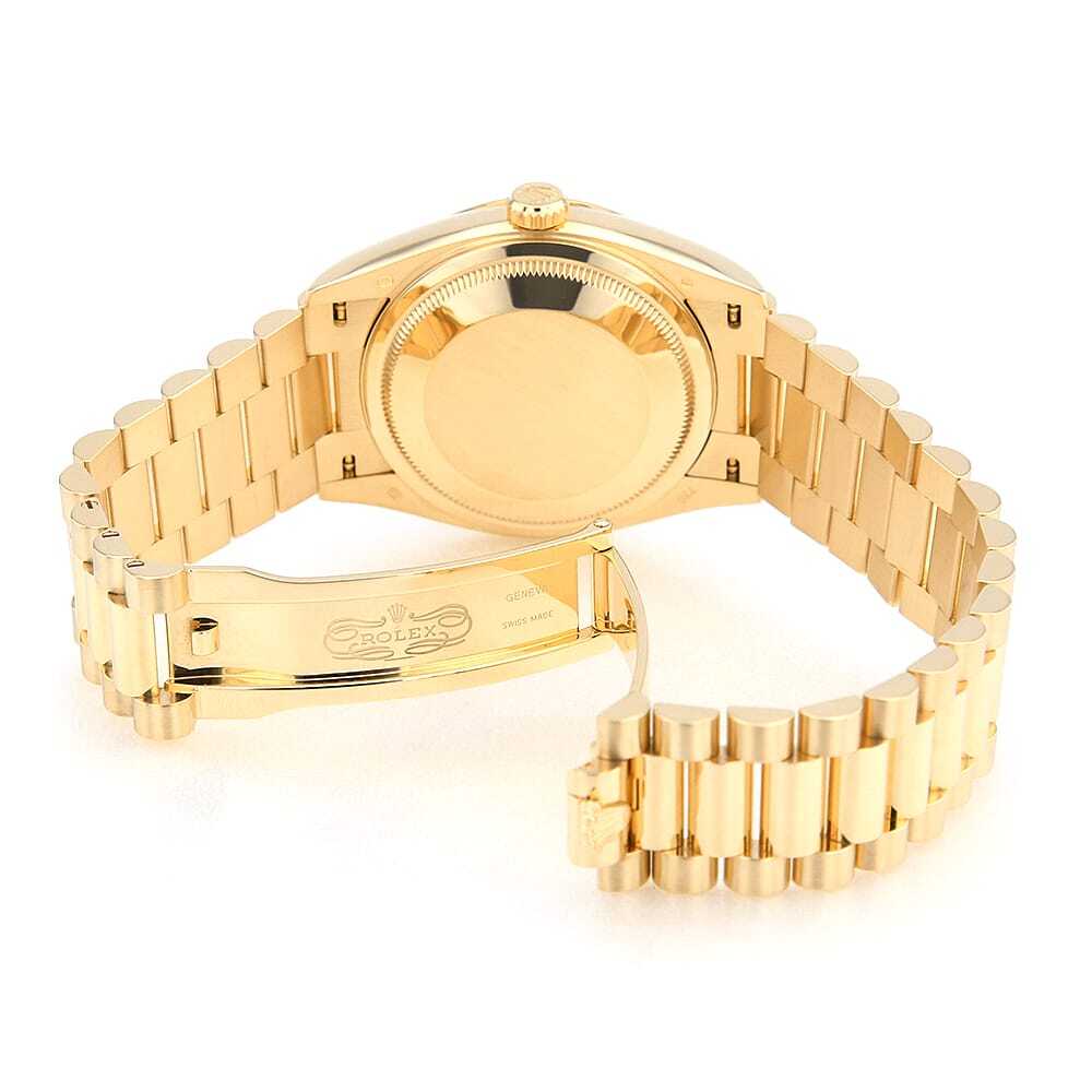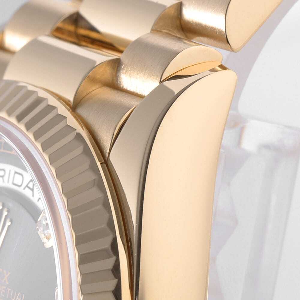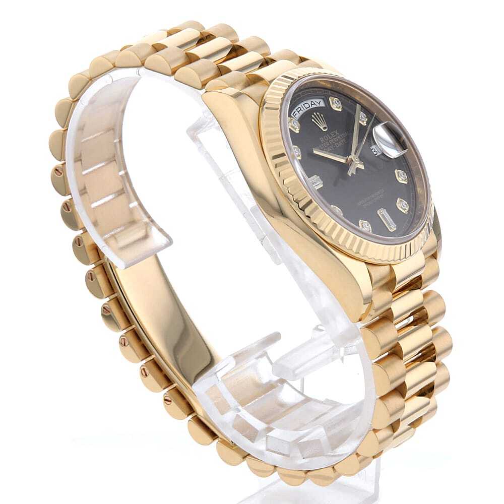 モデル情報 | 2019年発表、金無垢ケース径36mmのデイデイトです。8粒のダイヤモンドと2粒のバゲットダイヤモンドがブラックカラー上に配されているため、ダイヤの光沢感がより一層際立ちます。ムーブメントにはロレックスが開発した新世代ムーブメントキャリバー3255を搭載。パワーリザーブ約3日間。100m防水仕様。 |