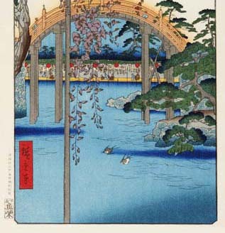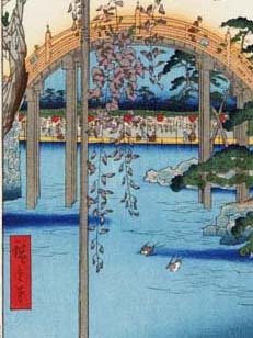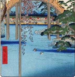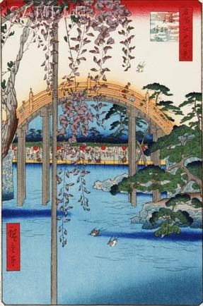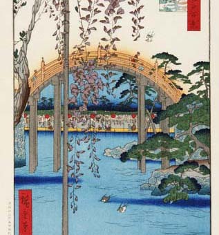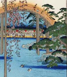 亀戸天神は江戸郊外の観光地で、境内の大小二つの太鼓橋と、