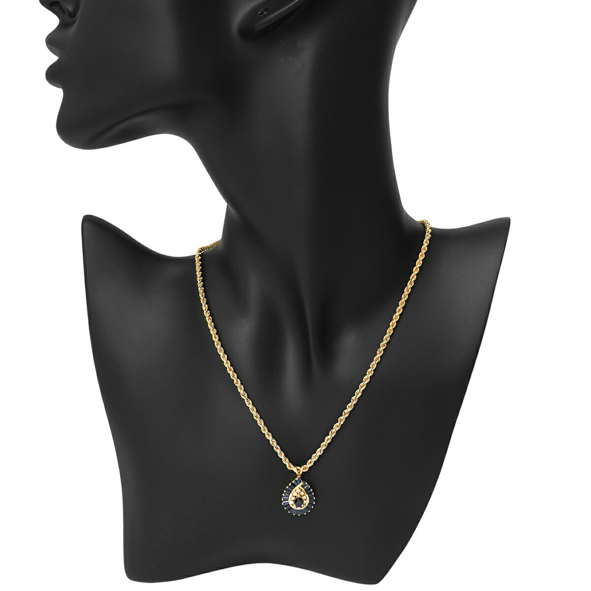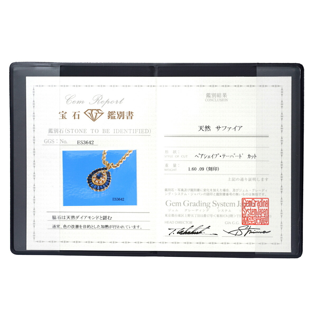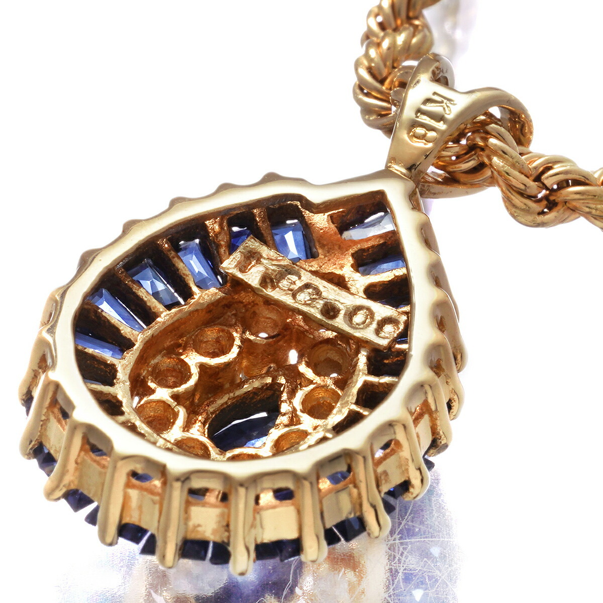 ペアシェイプカットのサファイヤの取り巻きにはメレダイヤ、テーパードカットのサファイヤを用いた、とても華やかなドロップ型のペンダントネックレス。ボリュームあるスクリューチェーンを使いで胸元に存在感を与えてくれるアイテムです。