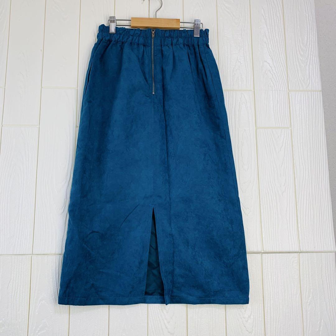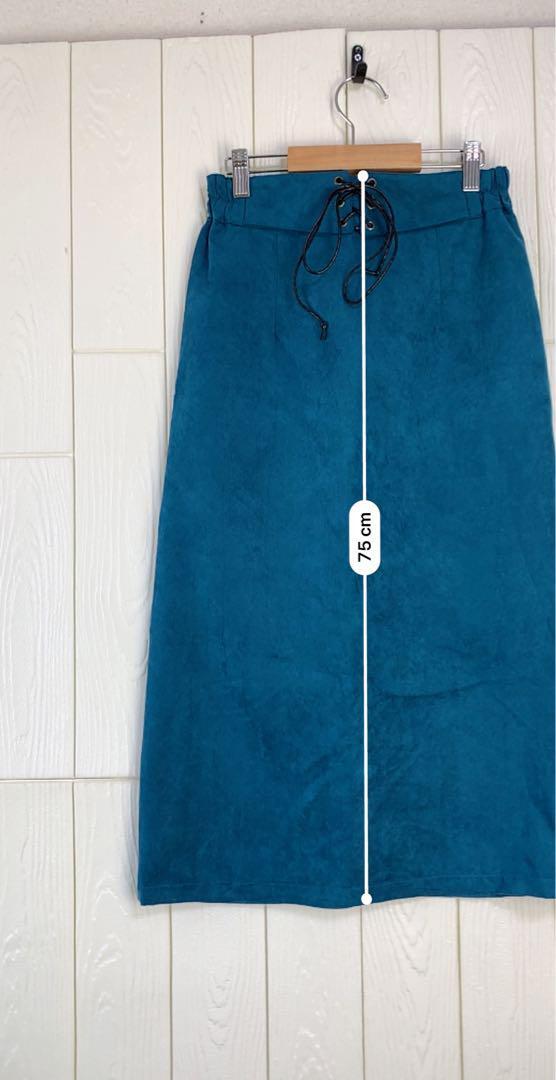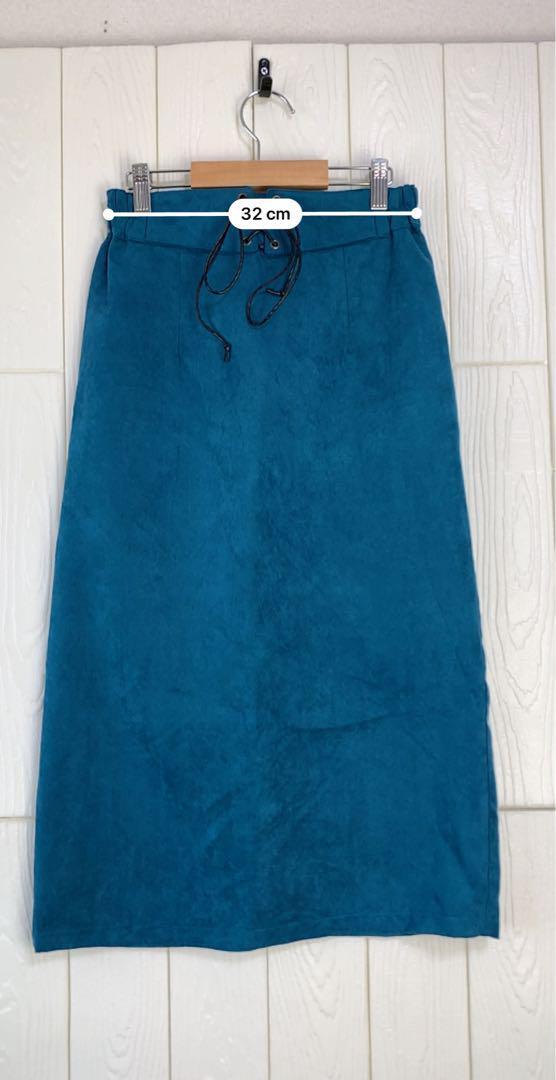 青色のタイトスカート、ウエスト64cm、丈75cm。