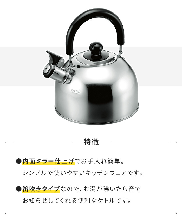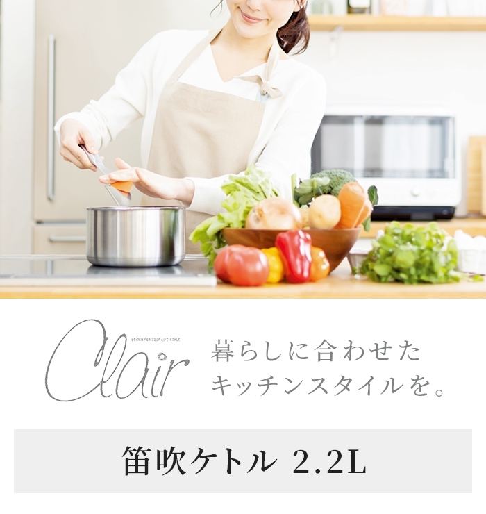 DESIGN FOR YOUR LIFE STYLE|Clair 毎日使うものだからお手入れ簡単・使いやすいキッチンウェアを。 お湯が沸いたら音でお知らせする笛吹ケトルです。 内面ミラー仕上げでお手入れ簡単。 ガス火やIHはもちろん、全ての熱源に対応しています。 |