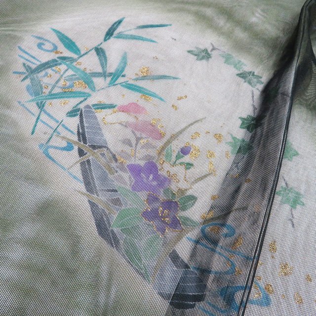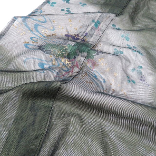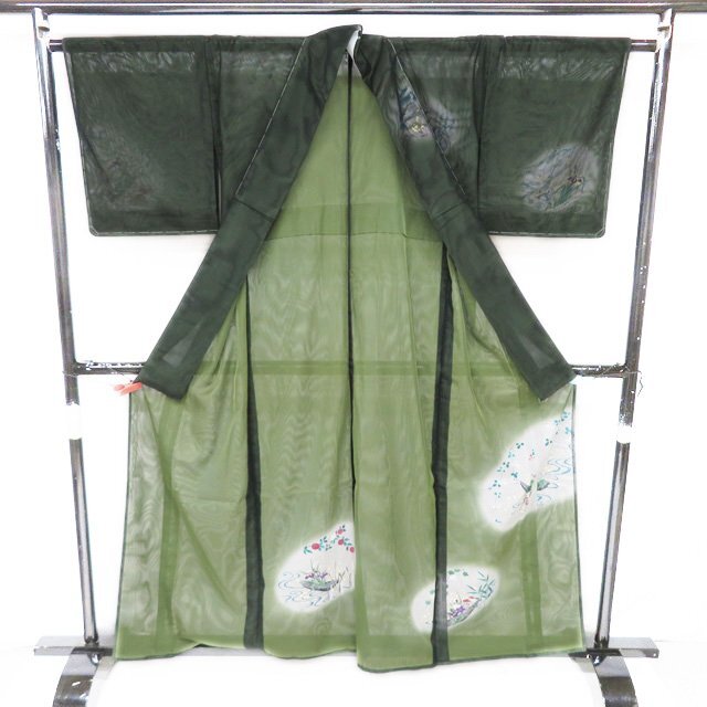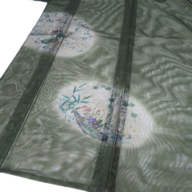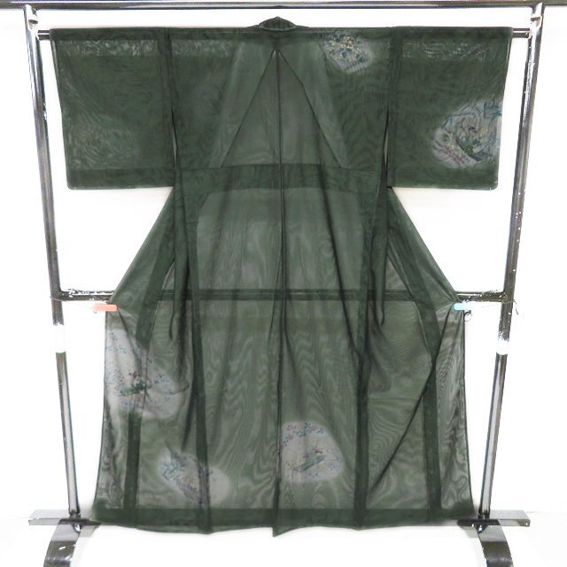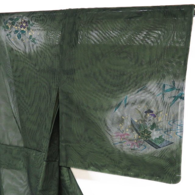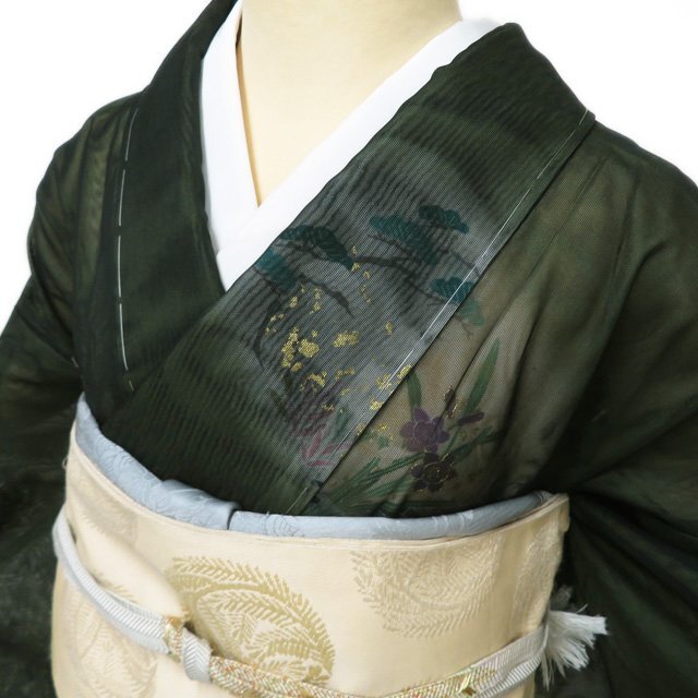 丈158.5cm(+11) 裄64cm(+1) 袖丈45cm(+5) 前幅25cm 後幅30.5cm ※サイズのお直し、承ります。 (身丈のみ、身幅のみのお直しは承っておりません) ※身丈は肩から測っております。 ※()内は※()内の数字はお直しで直せる長さを示しています。お仕立て直しの場合は胴裏を付け替えるため、さらに長く直せる場合があります。詳しくはお問い合わせください。 単位:cm 素材 正絹 商品ランク A ●着用時期 7月、8月(+-2週間) ●着用シーン 披露宴、パーティー、お出掛け、式典など ●お色 老緑色 多色 金 未使用の美しいお品物です。 居敷当の付いていないお品物です。 涼やかな和のお洒落をお楽しみくださいませ。 写真に写っている着物のみの販売で、帯等の付属品はついておりません。 一部商品は実店舗・他サイトでも並行して販売しておりますので売り切れの際はご了承ください。 その他多数販売中 kuku- | ||||||