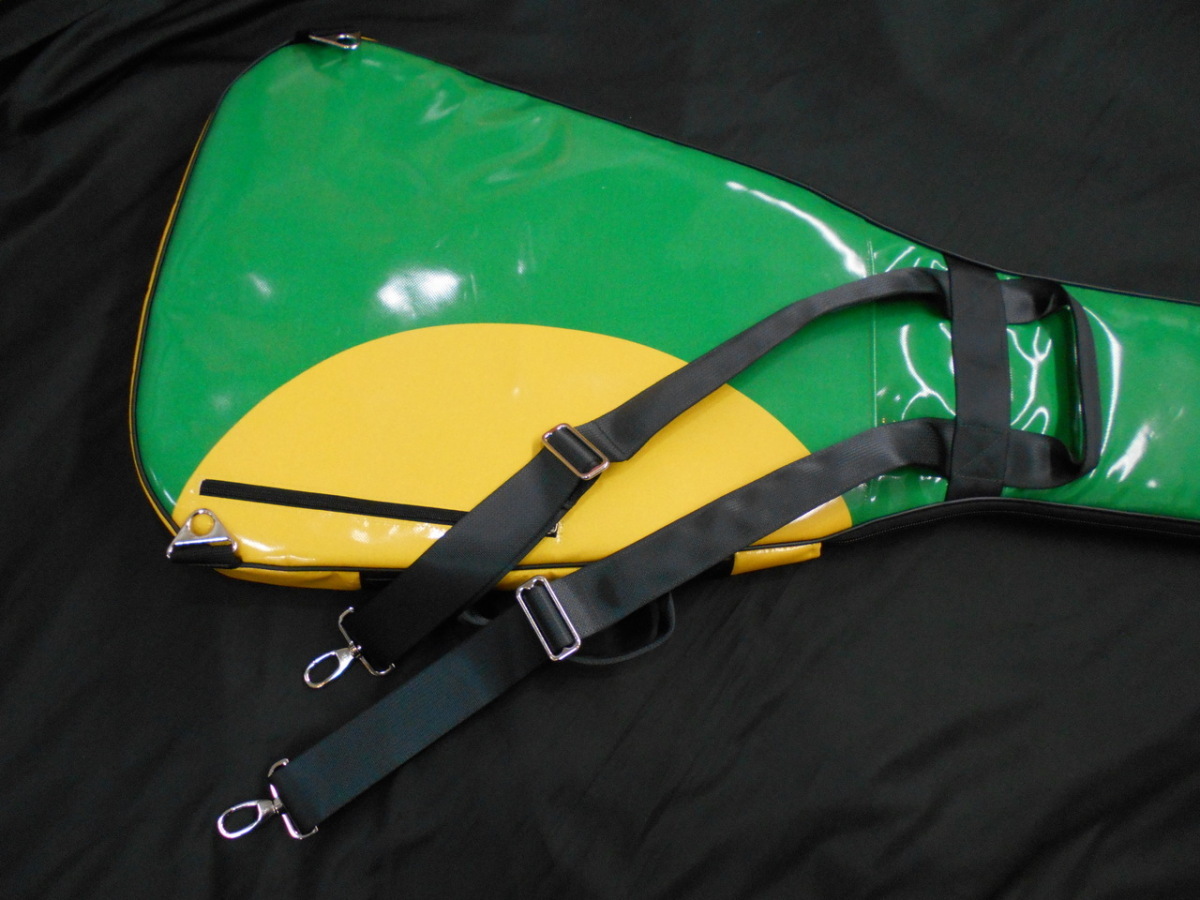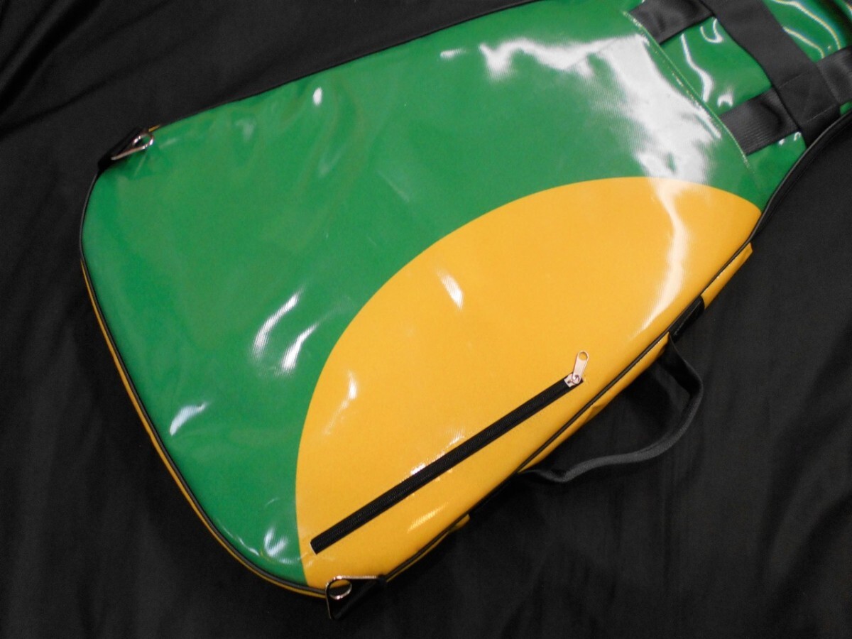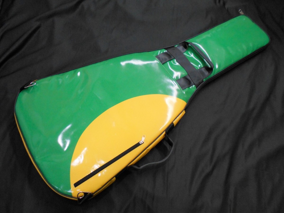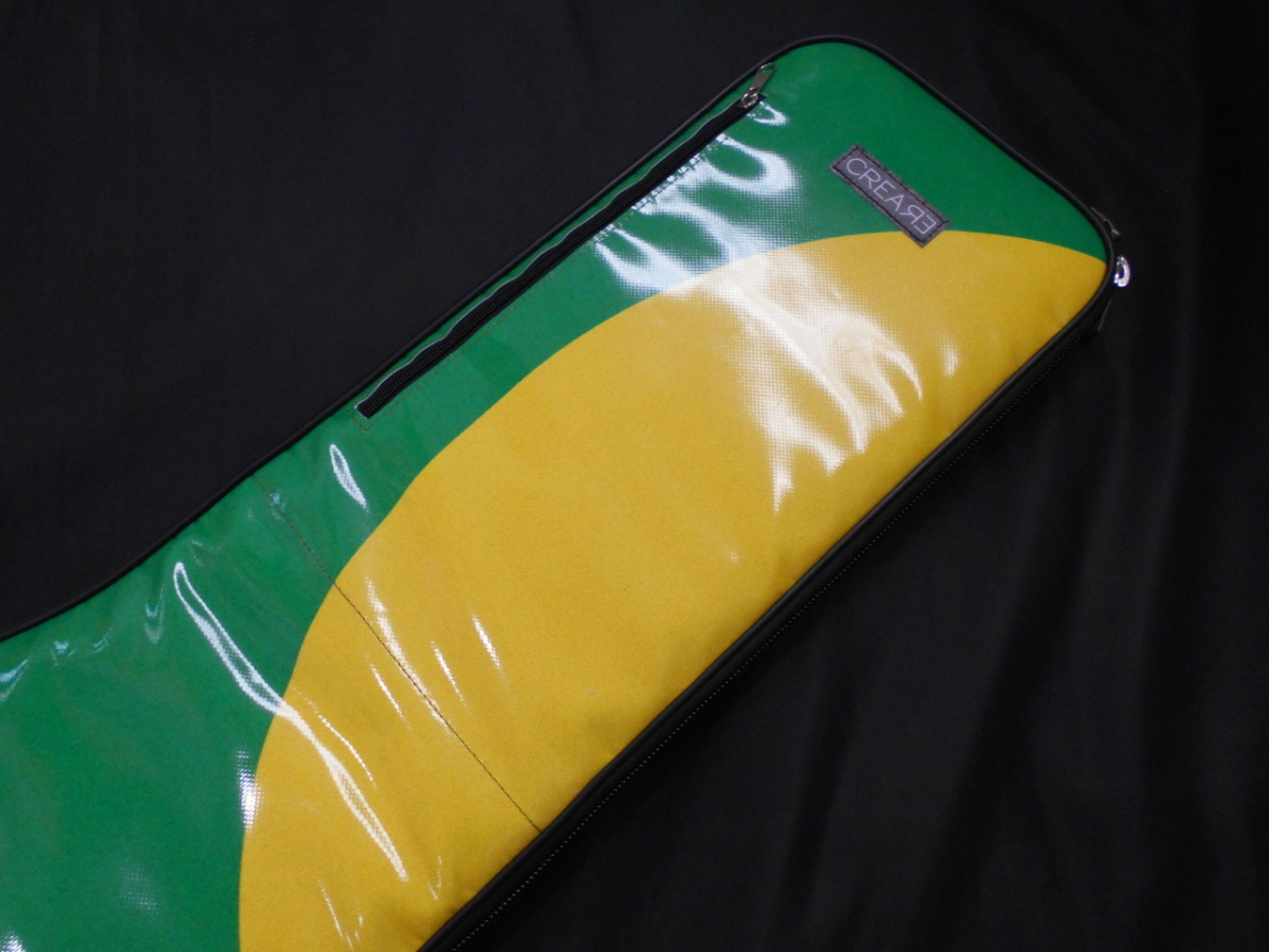 使用されている素材は、実際に使われその役目を終えたトラックのタープ、広告バナー、防水シートやバナー、シートベルト、毛皮など。その素材をクリーニング、アップサイクルし、ハンドメイドで一点一点縫製され作られたエコ・ギター・ケースです。