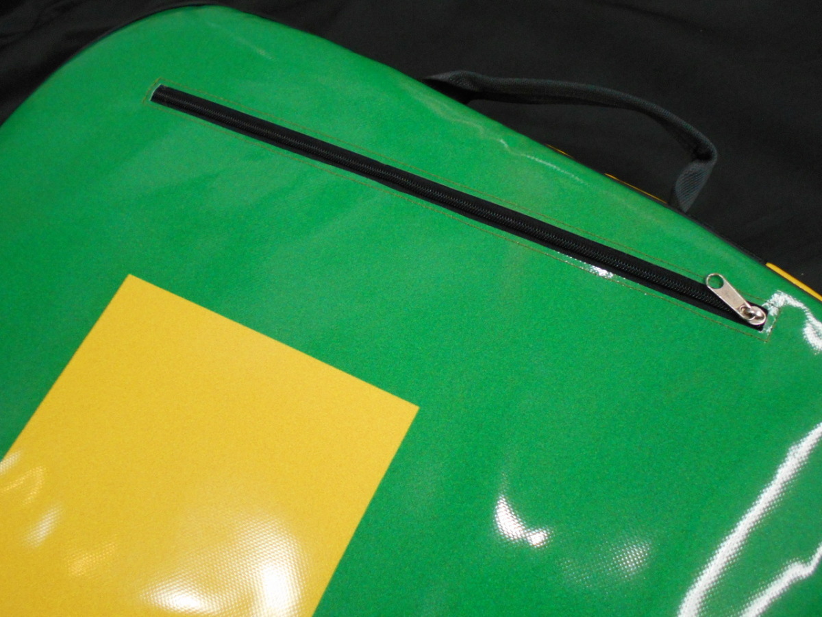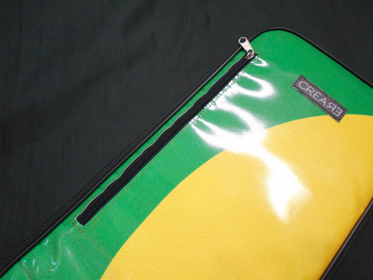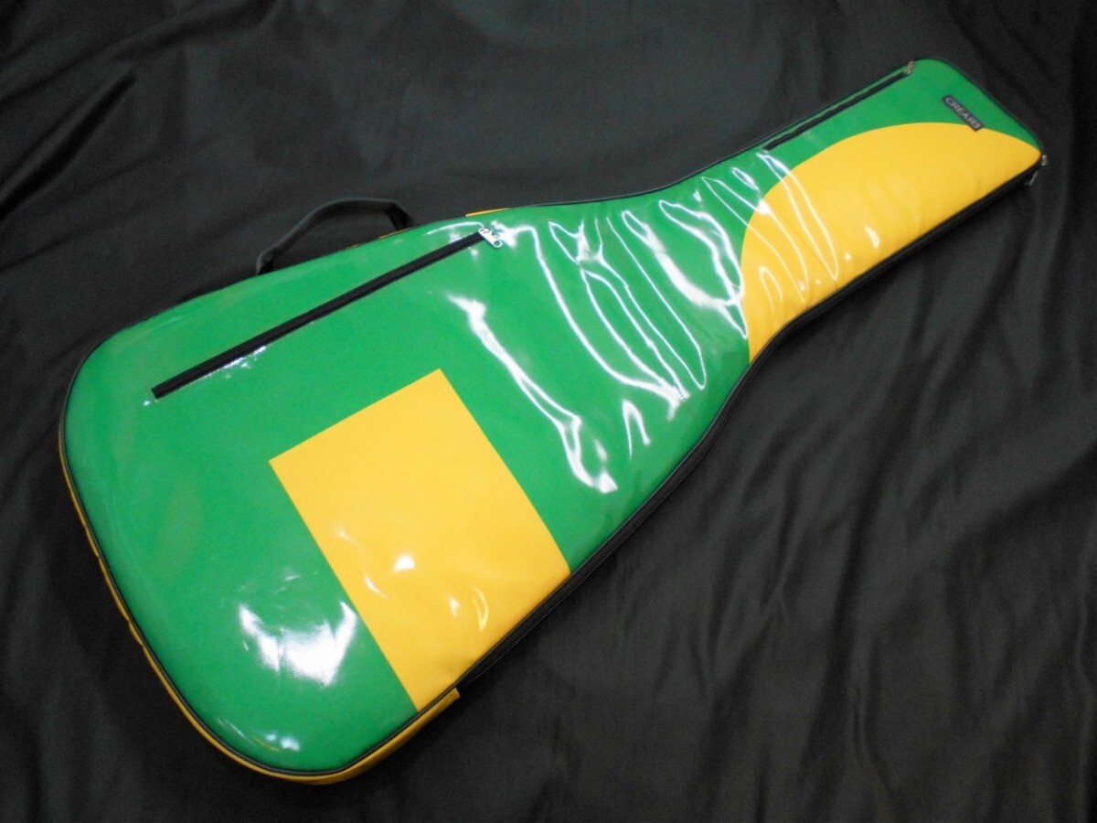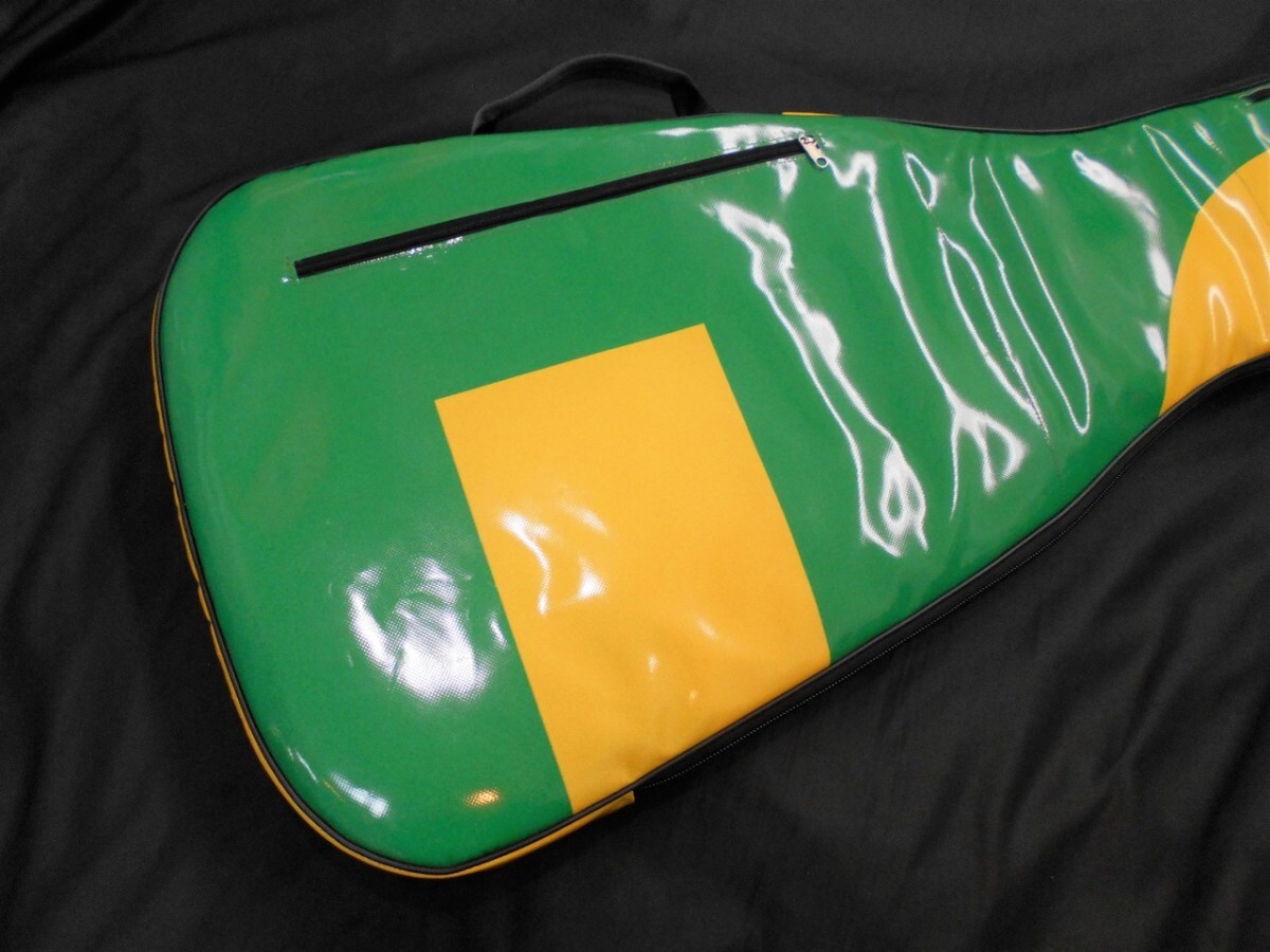 使用されている素材は、実際に使われその役目を終えたトラックのタープ、広告バナー、防水シートやバナー、シートベルト、毛皮など。その素材をクリーニング、アップサイクルし、ハンドメイドで一点一点縫製され作られたエコ・ギター・ケースです。
