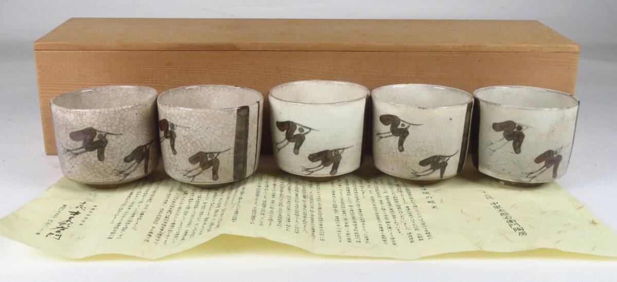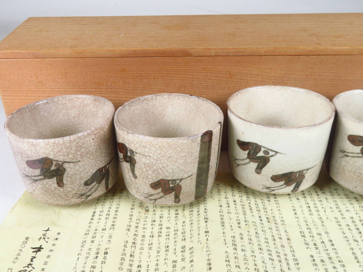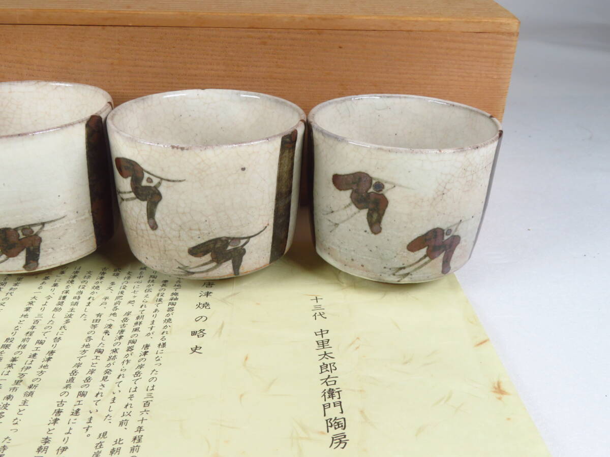 | 唐津焼 絵唐津 向付 十三代 中里太郎右衛門 作家 在銘 栞 共箱 茶道具 煎茶道具 湯呑 骨董品 古美術品 高さ6.5cm【317】 | ||