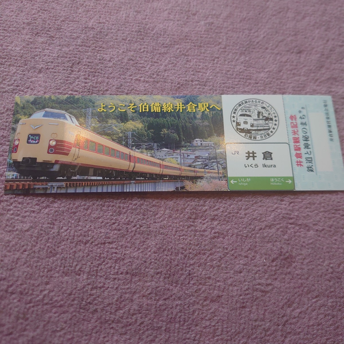 伯備線・井倉駅 記念証 381系「やくも」復活国鉄色、です。