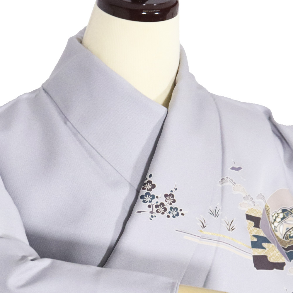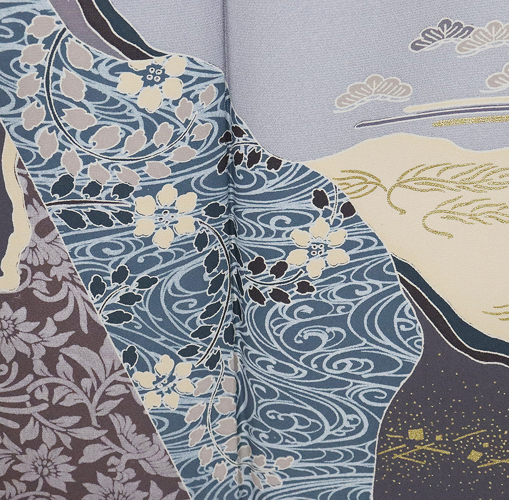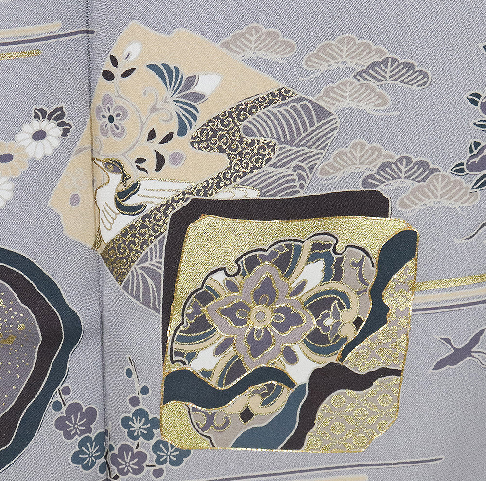 | 色・柄 | 訪問着 袷 濱縮緬地 ライトグレー(暁鼠色)地 色紙文 唐花・華文・松竹梅・パルメット唐草文様 金駒刺繍入り (写真では上手く色が出ない場合があります。ご了承下さい) |