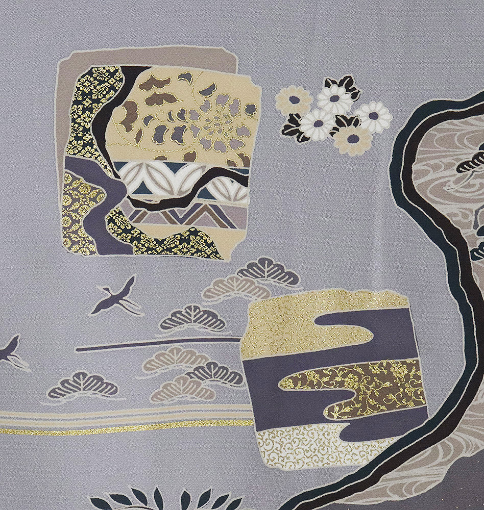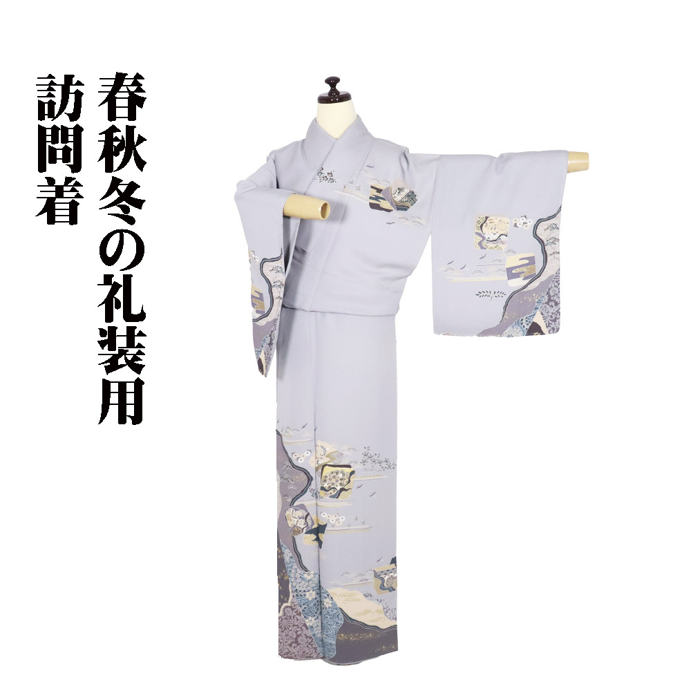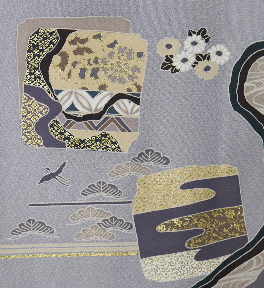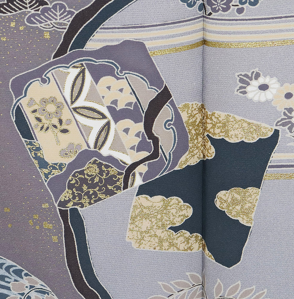 | 色・柄 | 訪問着 袷 濱縮緬地 ライトグレー(暁鼠色)地 色紙文 唐花・華文・松竹梅・パルメット唐草文様 金駒刺繍入り (写真では上手く色が出ない場合があります。ご了承下さい) |