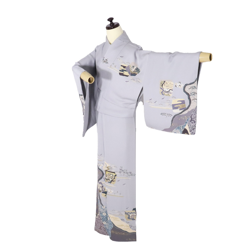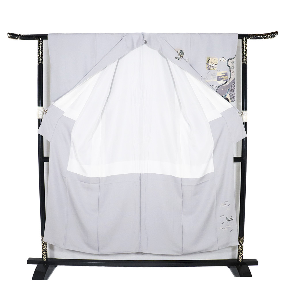 | 訪問着 袷 濱縮緬地 ライトグレー(暁鼠色)地 色紙文 唐花・華文・松竹梅・パルメット唐草文様 金駒刺繍入り 157 広襟 仕付け付き | |