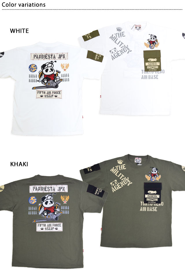 和柄ブランド【錦】の姉妹ブランドとして誕生した、お茶目なパンダをモチーフとした【PANDIESTA JAPAN】より「5TH AIR FORCEツイル切替半袖Tシャツ(585850)」のご紹介です。 今や、錦の定番モチーフとなった「錦PANDA」!! 今回は人気のミリタリーシリーズから新作が登場しました。 フロント左胸にはフラップ付きのポケットが縫い付けられており、表面にはミサイルとボックスロゴをプリント。 ポケット上部には蜂に扮したパンディエスタを刺繍しました。 バックには戦闘機に跨るビーパンダを刺繍。 絵柄上下のワッペンのみ、別生地での切替となります。 左袖にはエンブレムをプリントし、右袖にはフラップ付きのポケットを縫い付けました。 ボディーには、綿100%のしっかりとしたTシャツ生地を採用しています。 | |||||||||||||||||||||||||