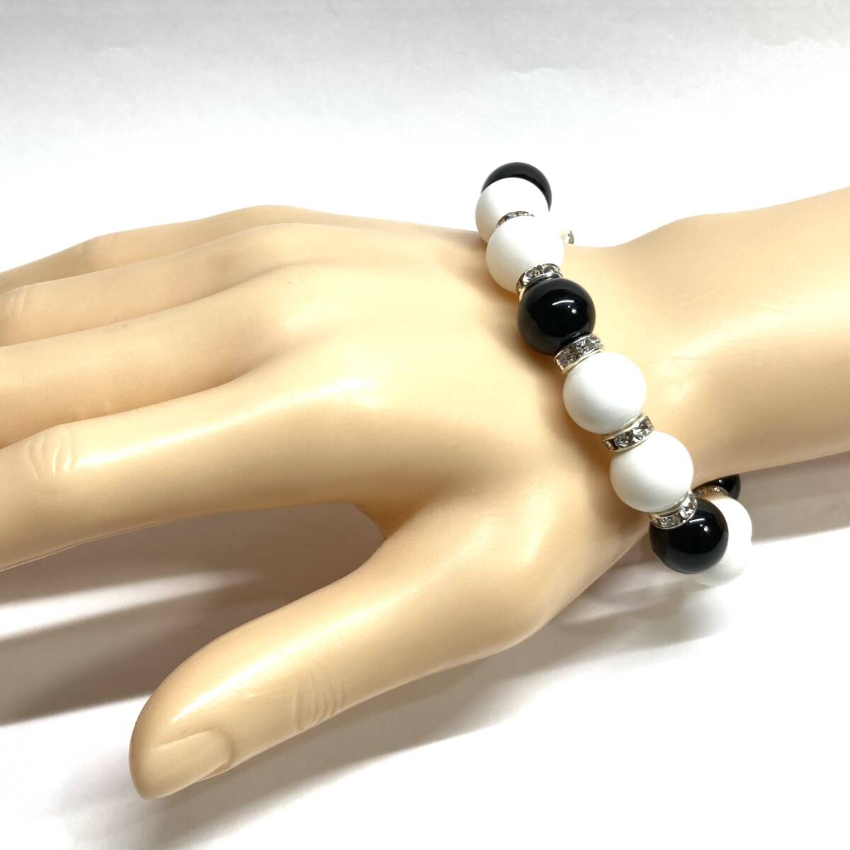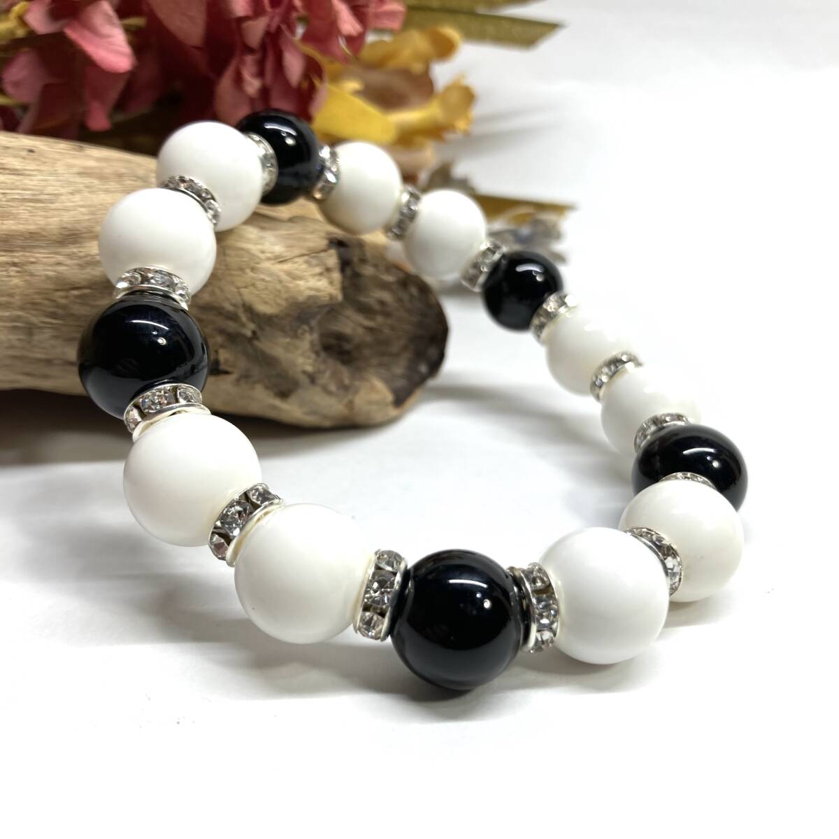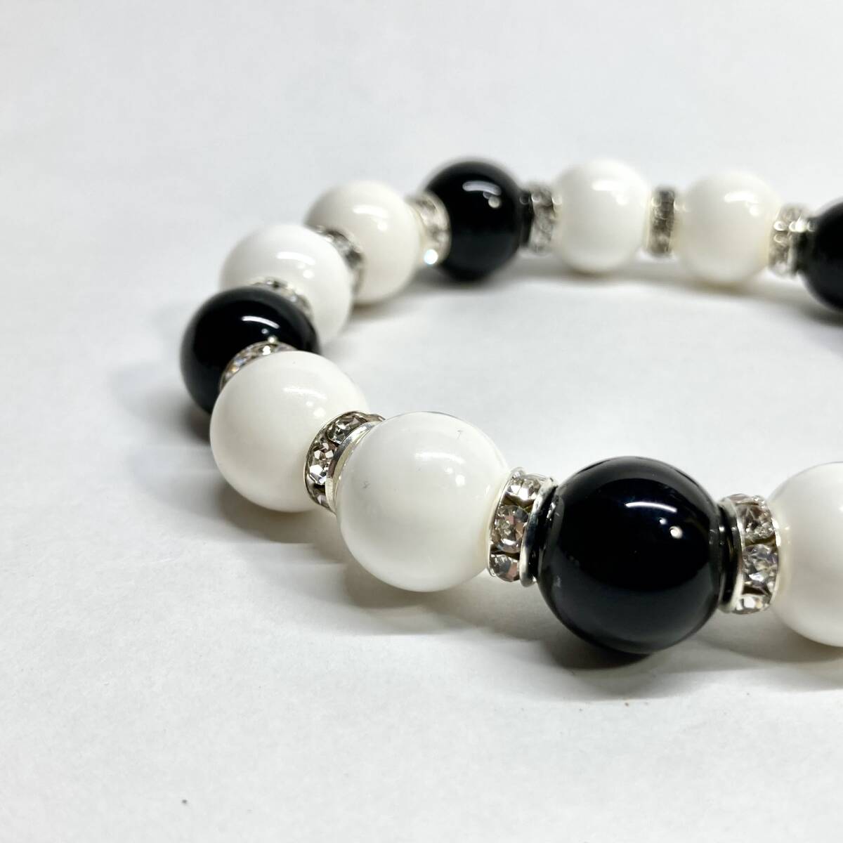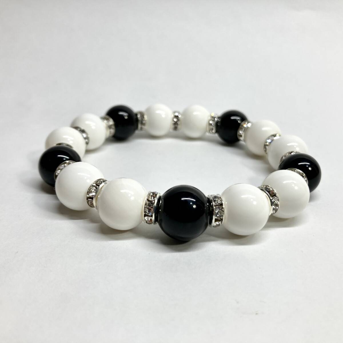 こちらは、ホワイトオニキスとオニキスを組み合わせたパワーストーンブレスレットです。間にはロンデルを挟み高級感あるデザインに仕上げております。程よくインパクトがある12mm玉を使用して内周約18cmです。(サイズ変更の場合は取引ナビにてご連絡をお願いします。) 数に限りがございますので気になる方はお早めにどうぞ。