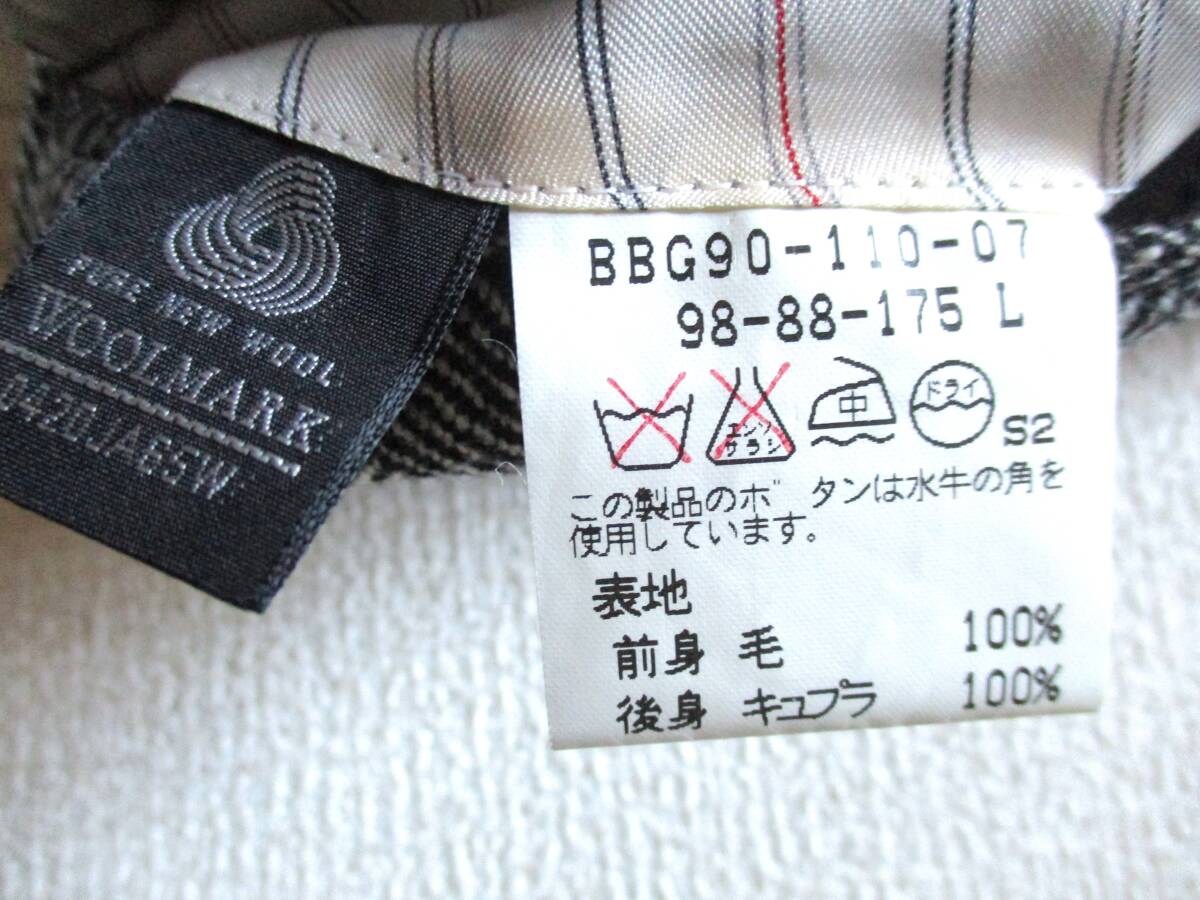 サイズ表記はL、100%ウール、日本製、色はグレー系です。