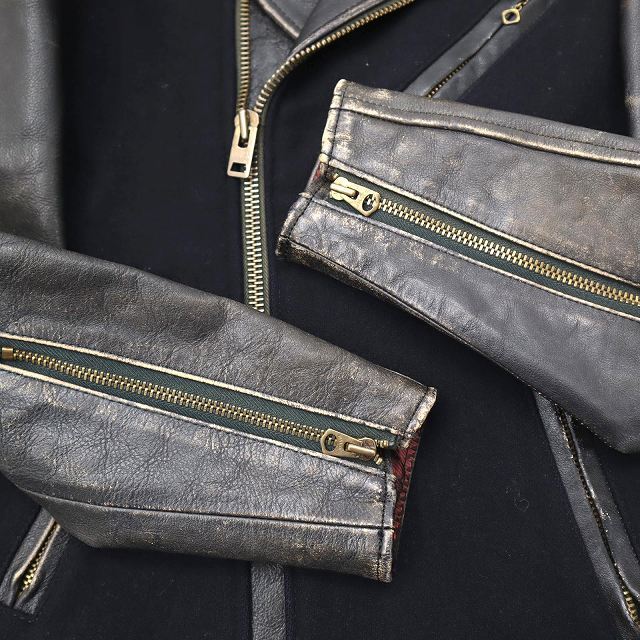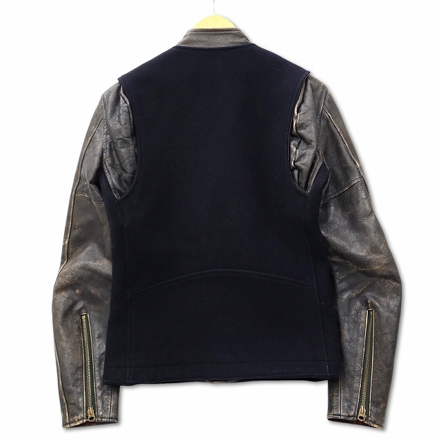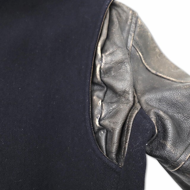 【状態】レザー部分の擦れや傷、袖口内側の汚れ、メルトン分部の擦れ、着用感がありますが、その他に目立ったダメージはなく、問題なくご使用いただける商品です。 ※一番下のボタンの合わせがありません。予めご了承ください。 ※あくまでも中古品ですので掲載写真や記載内容をご確認いただき、ご理解の上ご購入ください。