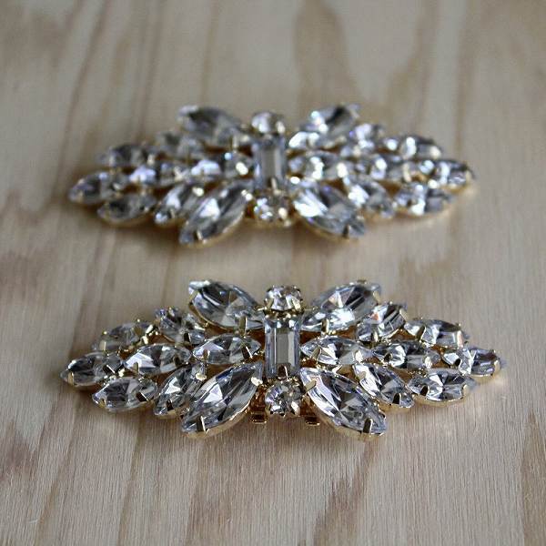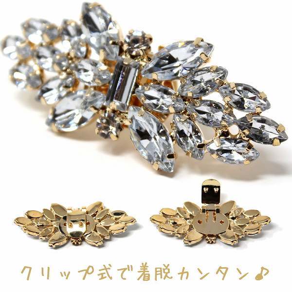 ・クリスタルからちらりと覗くゴールドが上品でおしゃれ。クリップ式で簡単に脱着でき、シンプルな靴を品よく華やかに飾ります。