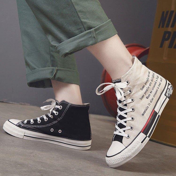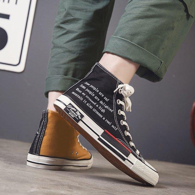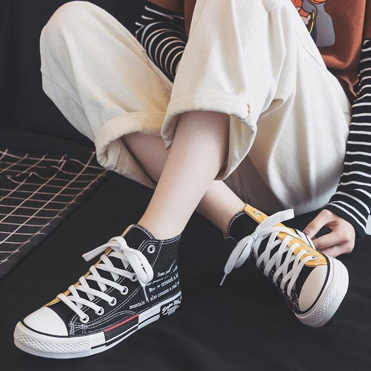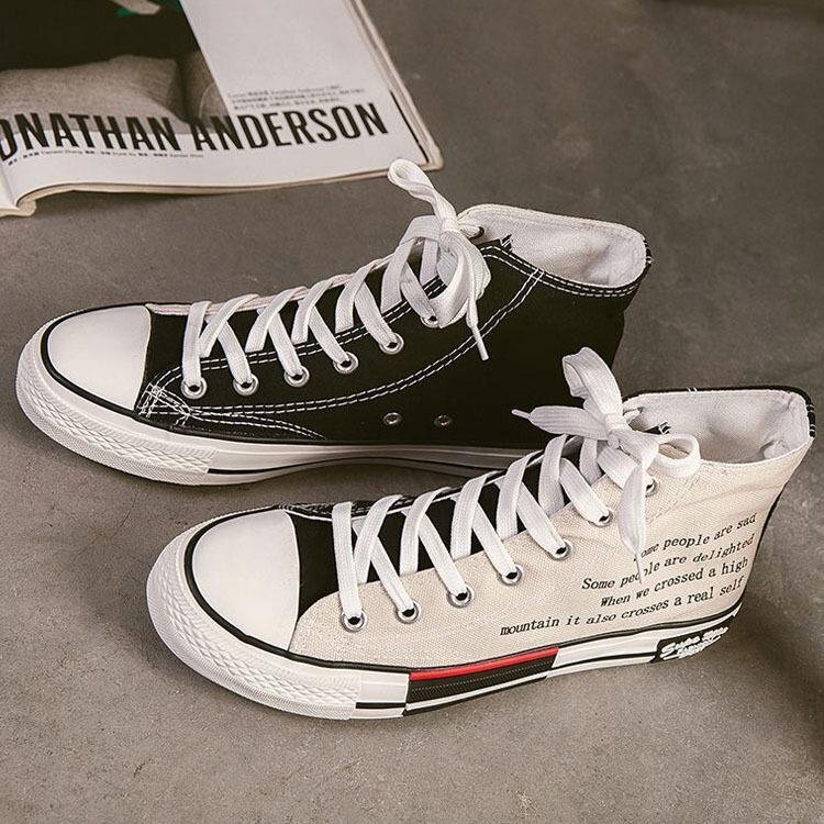 クレイジーパターンのキャンバスハイカットスニーカー。