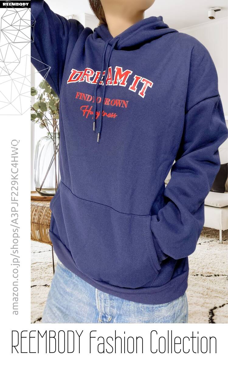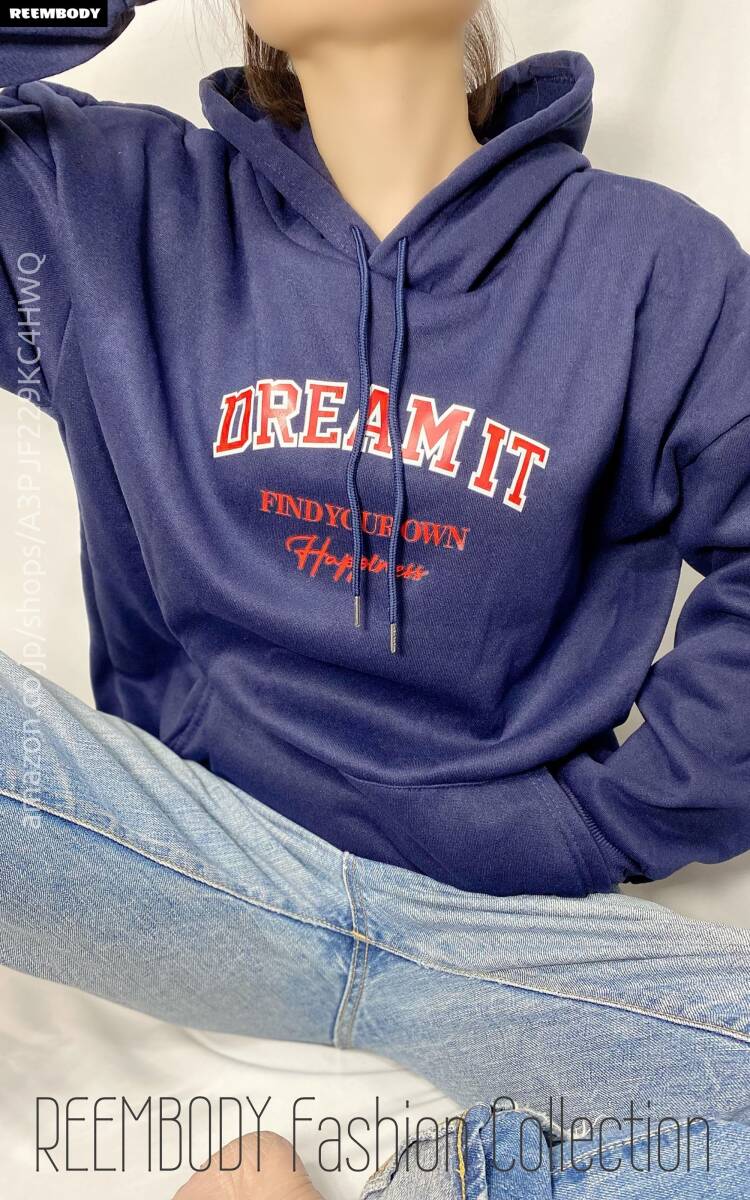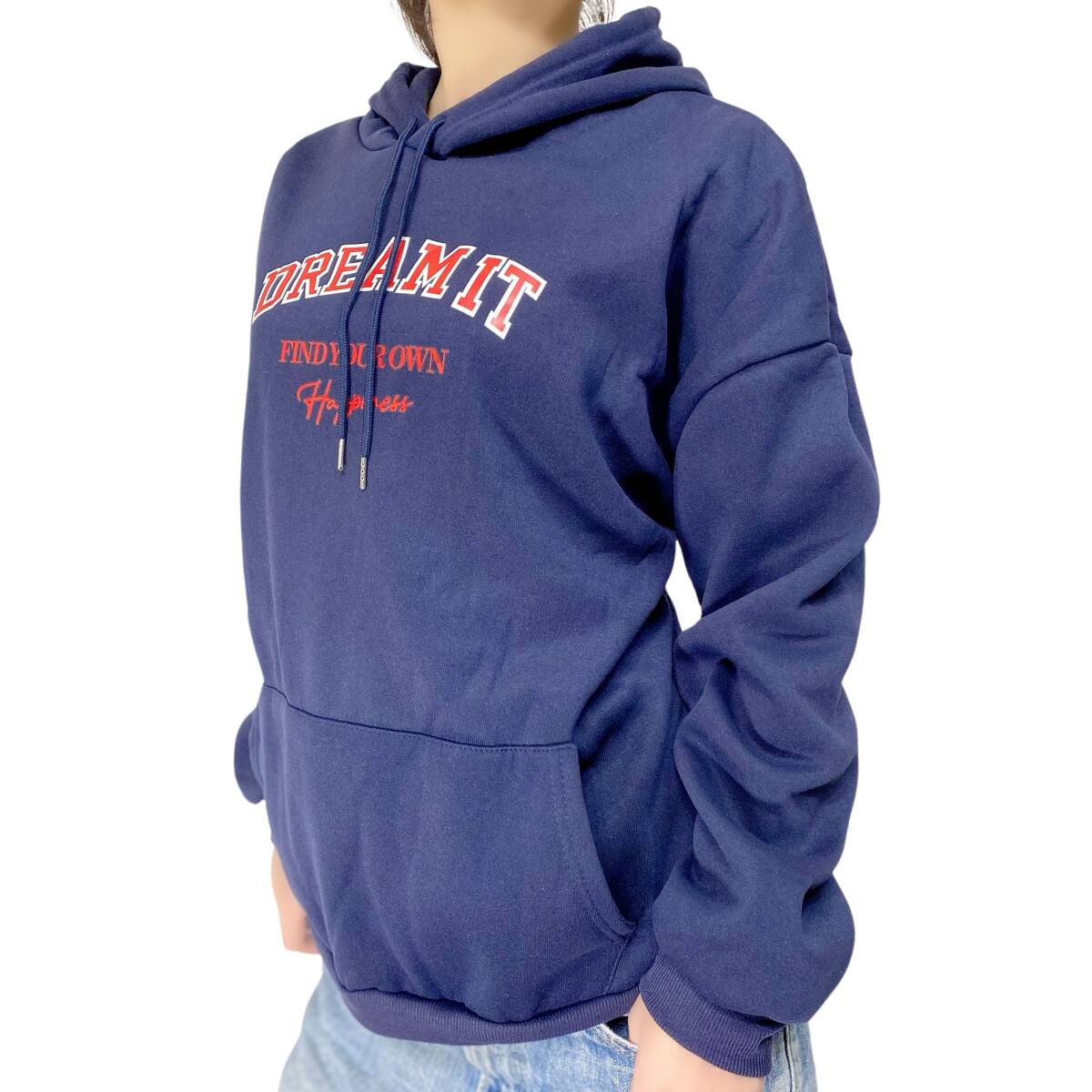 【在庫処分】レディース 長袖 パーカートレーナー ロゴプリント スウェットトップスカジュアル ポケット付 ネイビー 2XLサイズ