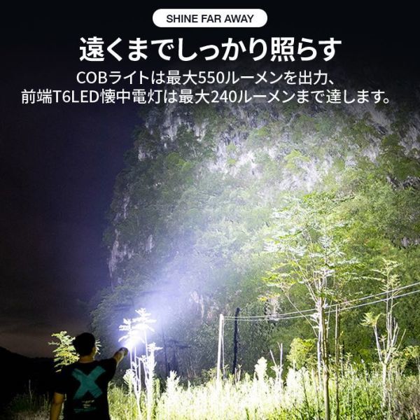 3種類の光源で、さまざまな照明ニーズに楽に対応できます。COBライト面発光は最大550ルーメンを出力でき、前端のライトは最大240ルーメンの明るさに達します。