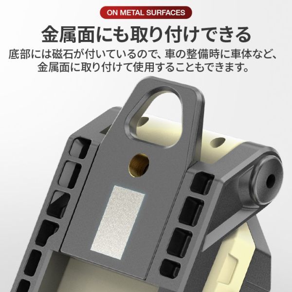 作業灯の底部に磁石が付いているので、金属面に取り付けての使用もできます。車の整備時に車体に付けたり、狭い電工室で鉄の配管に付けたりして、臨時照明にすることもできます。