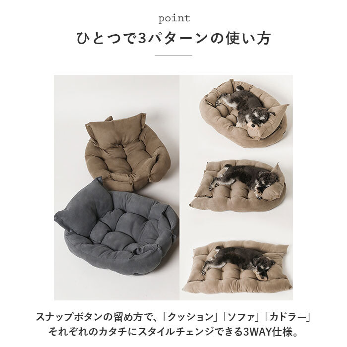 | 商品説明 | ・・お気に入りのカタチがきっと見つかる!シーンに合わせてフォルムが変わる「3WAYペットベッド(Lサイズ)」が新登場。 ・【ひとつで3パターンの使い方】 ・スナップボタンの留め方で、「クッション」「ソファ」「カドラー」それぞれのカタチにスタイルチェンジできる3WAY仕様。 ・【ゆったりクッションスタイル】 ・スナップボタンをすべて開放すると、ゆったりとくつろげるフラットなクッションスタイルに。 ・【ふかふかソファスタイル】 ・片側の大きな背もたれクッションを立ち上げ、両端のフラップを留めれば「ソファスタイル」に。あご枕の好きなワンちゃん、ネコちゃんにぴったり。 ・【まんまるカドラースタイル】 ・両側の背もたれクッションを立ちあげ、丸くカタチを整えるようにフラップを留めると「カドラースタイル」の完成。包みこまれるようなカタチでホッとリラックス。 ・【高級感のあるスエード調素材】 ・肌触りが滑らかで、ペットの毛がくっつきにくいスエード調生地仕上げ。 ・【ご家庭でお洗濯OK!】 ・汚れが気になったら、ご自宅で手軽に手洗いができるから、いつでも清潔。 ・【底付き感のない快適な寝心地】 ・ベッドの生地内側には、ふかふかのポリプロピレン綿素材をたっぷり充填。ほっこり暖かな寝心地で、ワンちゃんネコちゃん大満足。 ・【中型犬にぴったりLサイズ】 ・小型~中小型のワンちゃんはゆったりと、柴犬やコーギーなど中型のワンちゃんもすっぽりと丸まって寝転べるサイズ感。 ・【寒さの苦手なコに最適】 ・母ネコ・母イヌの懐に抱かれたようにすやすやとくつろげるペットベッド。秋冬時期の寒さ対策にオススメ! |