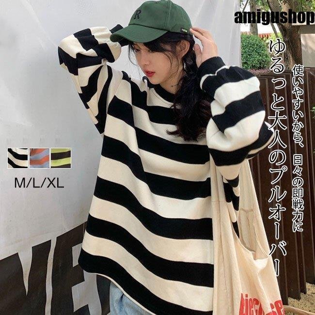 トレーナー スウェット プルオーバー 秋新作 ボーダー 長袖 大きいサイズ 秋冬 トップス ゆったり 韓国風 ビッグシルエット オレンジM