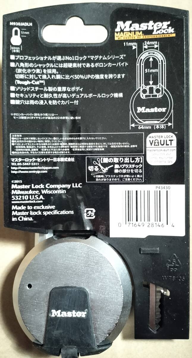 Master Lock「マグナム」シリンダー式南京錠(プロ仕様) 鍵4本付 M930JADLH 超硬素材シャックル「ボロンカーバイト」(炭化ホウ素)採用