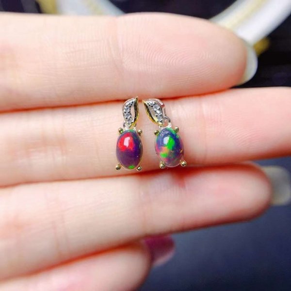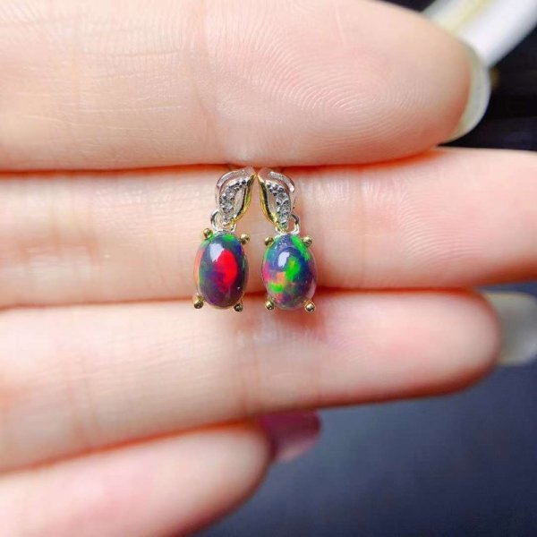 ブラックオパールピアス、5x7mm、925シルバー、シンプルなデザイン、美しい火の色、925純銀