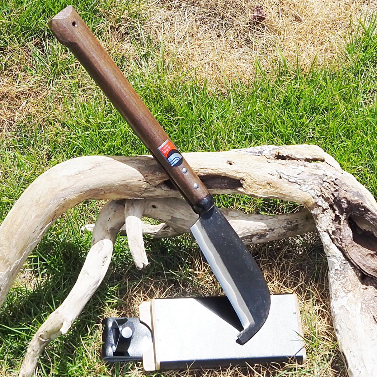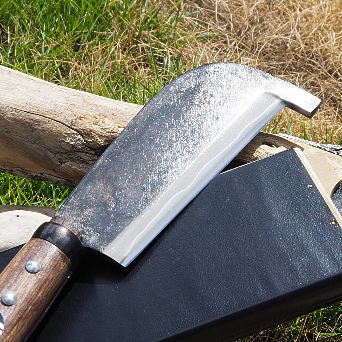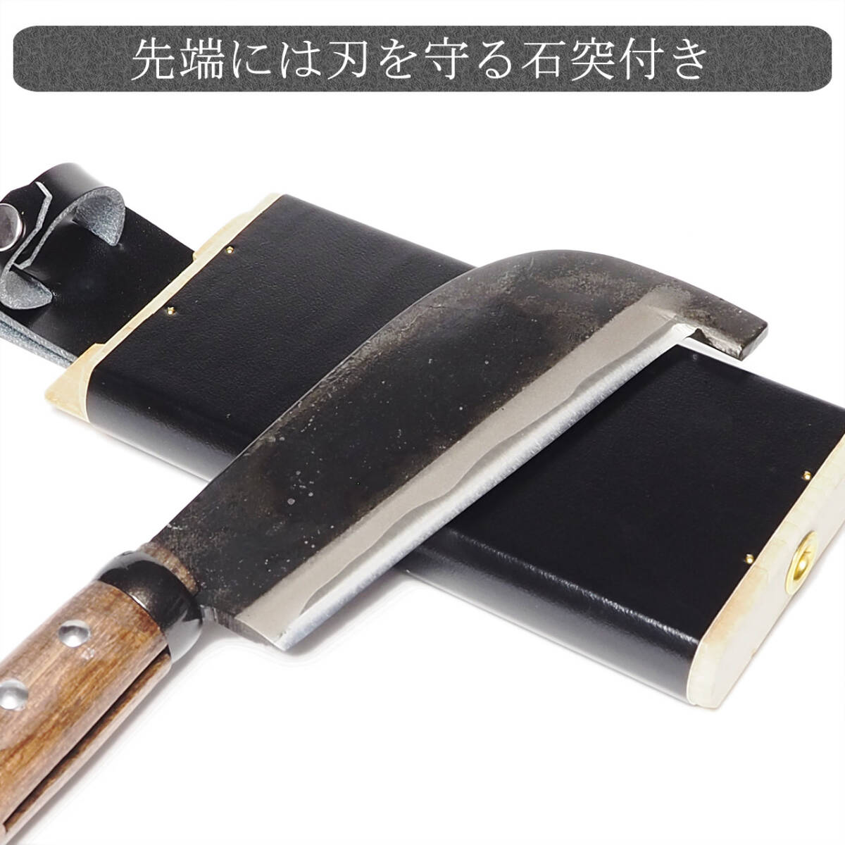 腰鉈に比べると少し幅広で、刃の先端には、石などに当たって刃がこぼれるのを防ぐために、