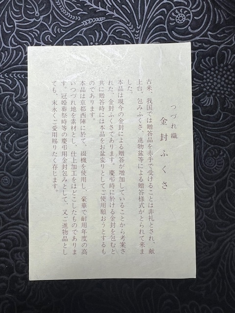 | 商品説明 | 【丸紋/つづれ織り 金封ふくさ】 未使用品です。 付属品は画像に写っているもので全てとなります。 こちらの商品は保管期間があります。 保管に伴う多少の傷、汚れ等ある場合もございます。ご理解の上、ご入札お願い致します。 |