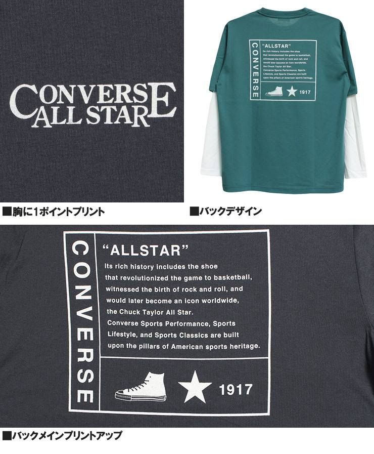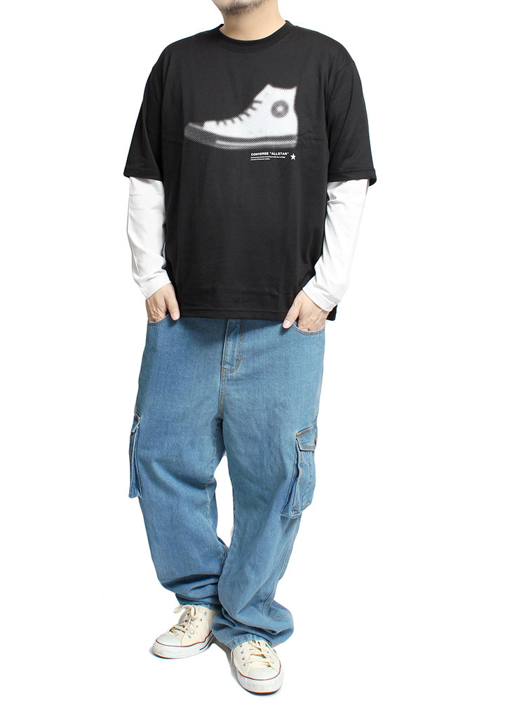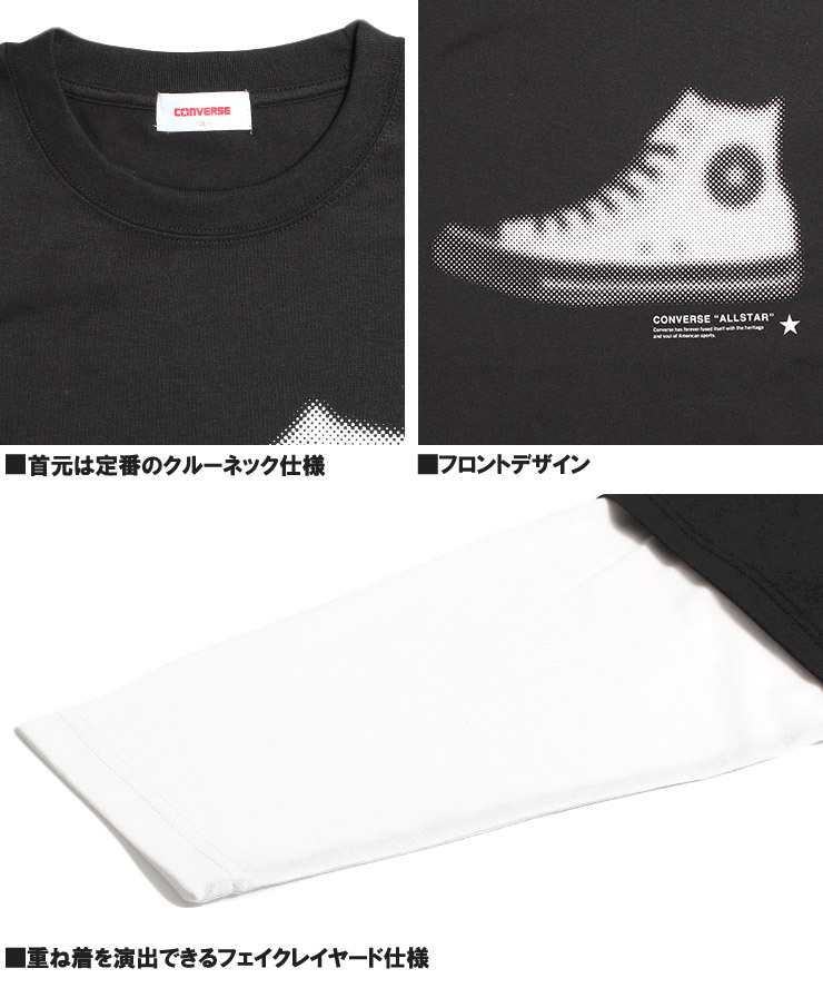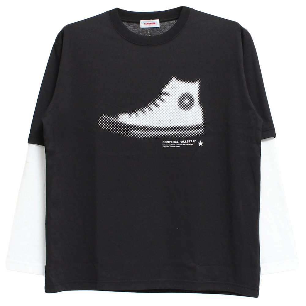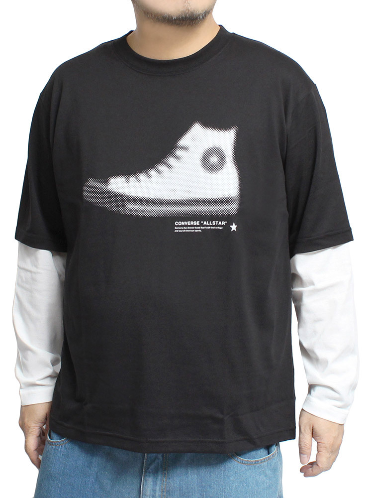 商品名 | 【新品】 3L ブラック コンバース(CONVERSE) 長袖Tシャツ メンズ 大きいサイズ フェイクレイヤード ロゴ シューズ プリント クルーネック カットソー |