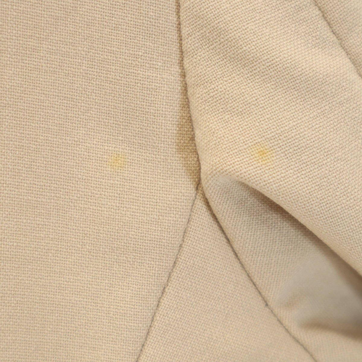 詳細 | ジャケット裏地全体にシミ汚れ、表地に芯地の剥離で凹凸があります。脇にシミ、袖口に変色、後裾がほつれてたるみがあります。スカートのベンツに破れ、前にシミ汚れあり。古着にご理解の上ご購入をお願い致します。 |