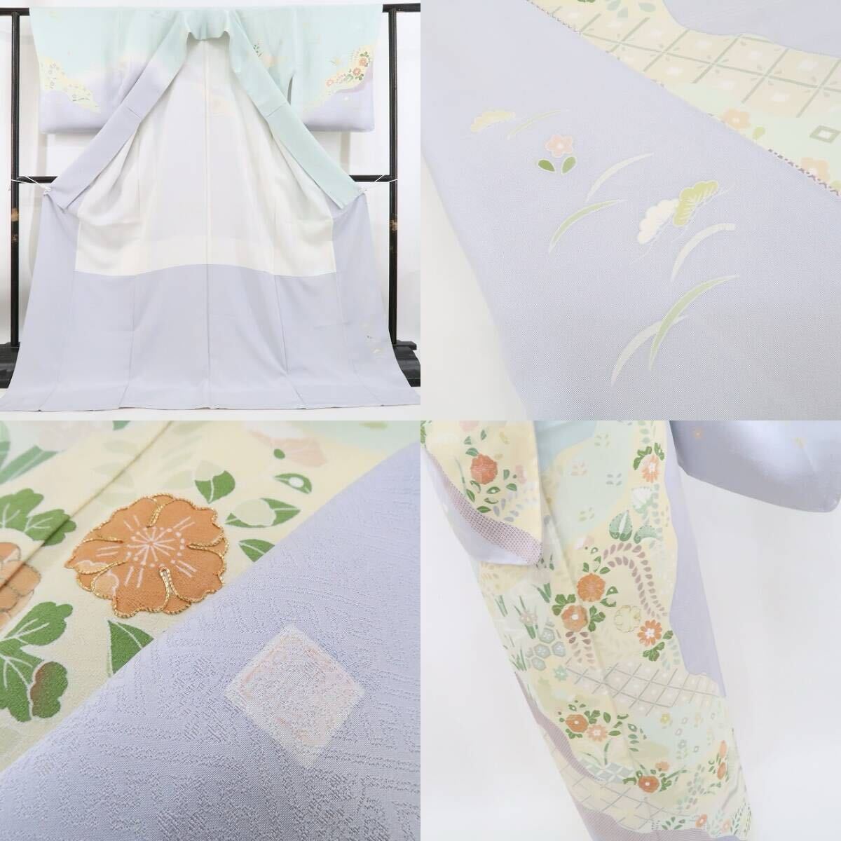 よく見れば、紗綾形の地紋を広げる一面にどこかメルヘンチックな雰囲気で顔を出し流れをつくる菊や萩、松、藤や菖蒲、葵や桐、桜、七宝や亀甲が、優しい色づきに活き活きとした表情にさり気ない隠し味のように金色の晴れ化粧をした姿を紛れさせ、見つける者に小さな幸せと喜びを運び、袖を通す者に華を添える、京友禅落款正絹仕付け糸付作家物訪問着でございます。