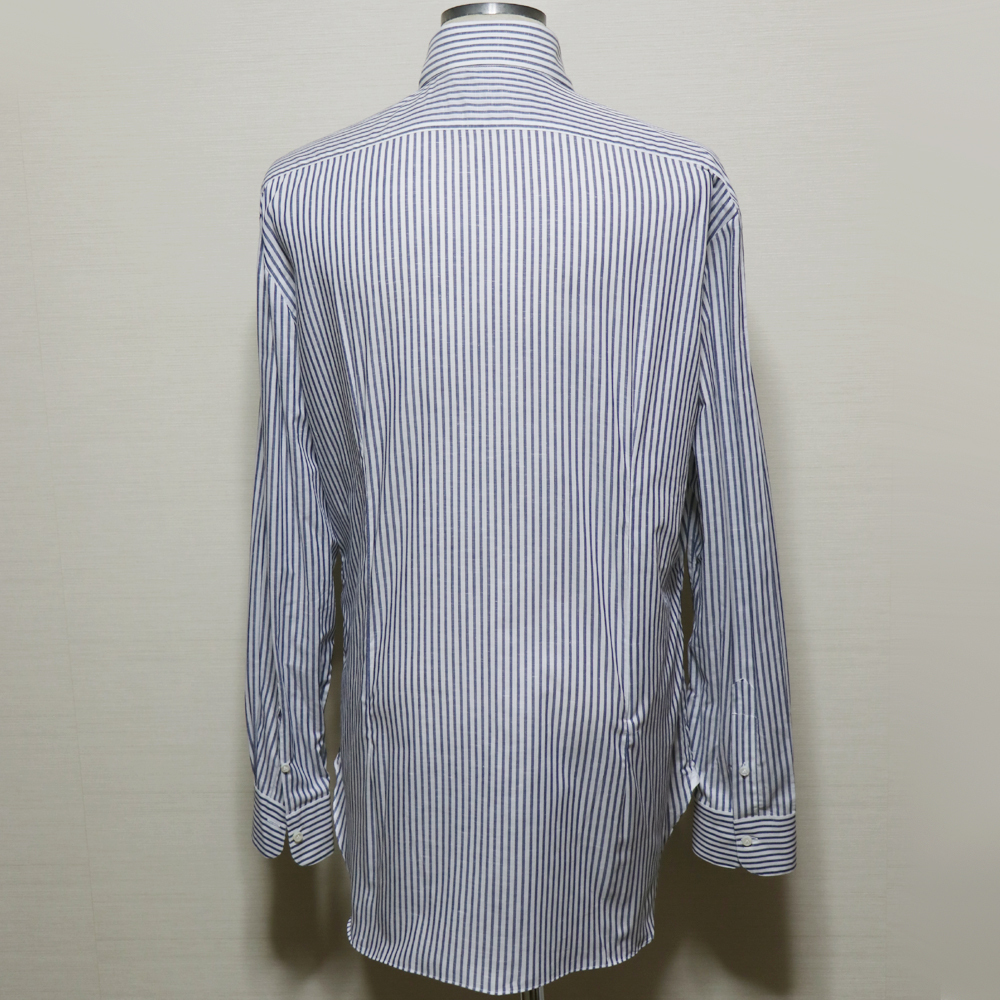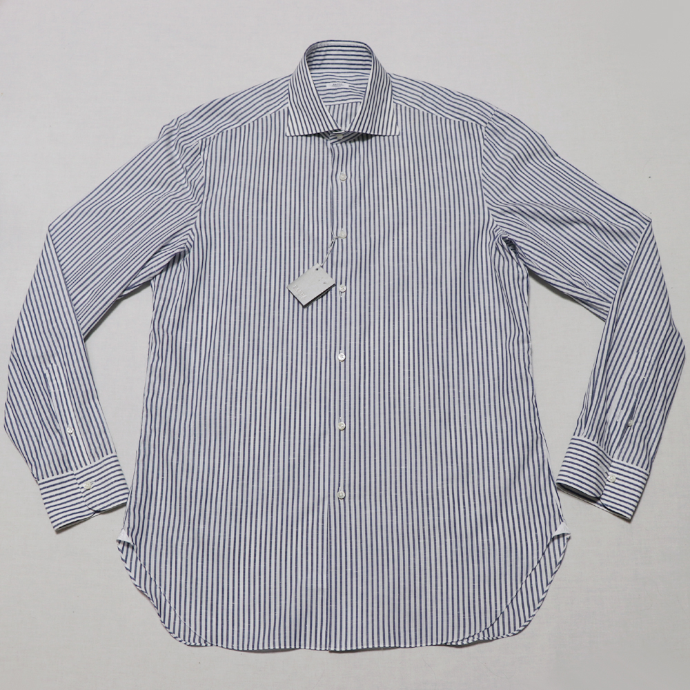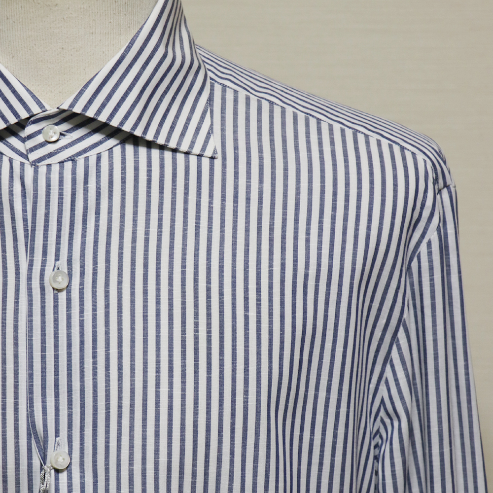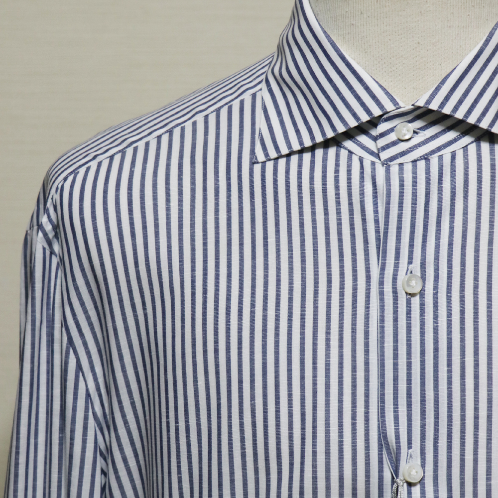 コシはあるが薄手の最高級綿麻生地にナポリスタイルの美しいワイドカラー。シックで爽やかなストライプ柄に定番のシルエット。裾部分には白のガゼットに「B」の刺繍がさりげないワンポイント。